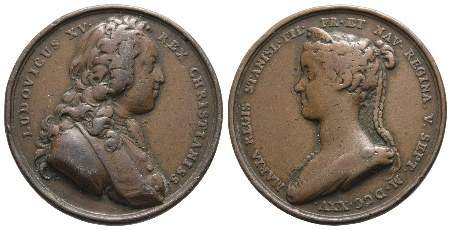 Designs by J. Duvivier. LUDOVICUS XV. REX CHRISTIANISS., draped bust to right, DU VIVIER in small lettering on truncation / MARIA REGIS STANISL. FIL. FR. ET NAV. REGINA. V. SEPT. M.DCC.XXV., draped bust to left; DU VIVIER in small lettering on truncation. 31.59, 41mm, 12h.