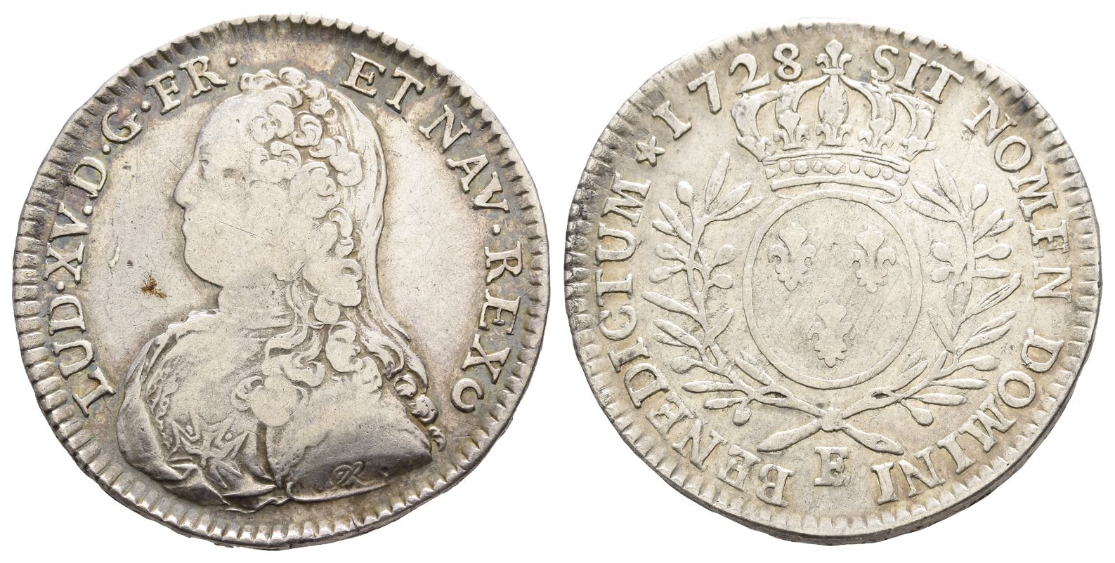 Designs by Joseph Roëttiers. LUD • XV . D • G • FR • ET NAV • REX (crescent), draped bust to left; JR. in small lettering on truncation / SIT NOMEN DOMINI BENEDICTUM ★ 1728, round shield of France crowned, between two olive branches linked at the base; E (mintmark) below. Edge inscription: DOMINE SALVUM FAC REGEM. Dyplessy, Royales 1676; Gad R2 313; Ciani 2118. 14.51gr, 33mm, 6h.
