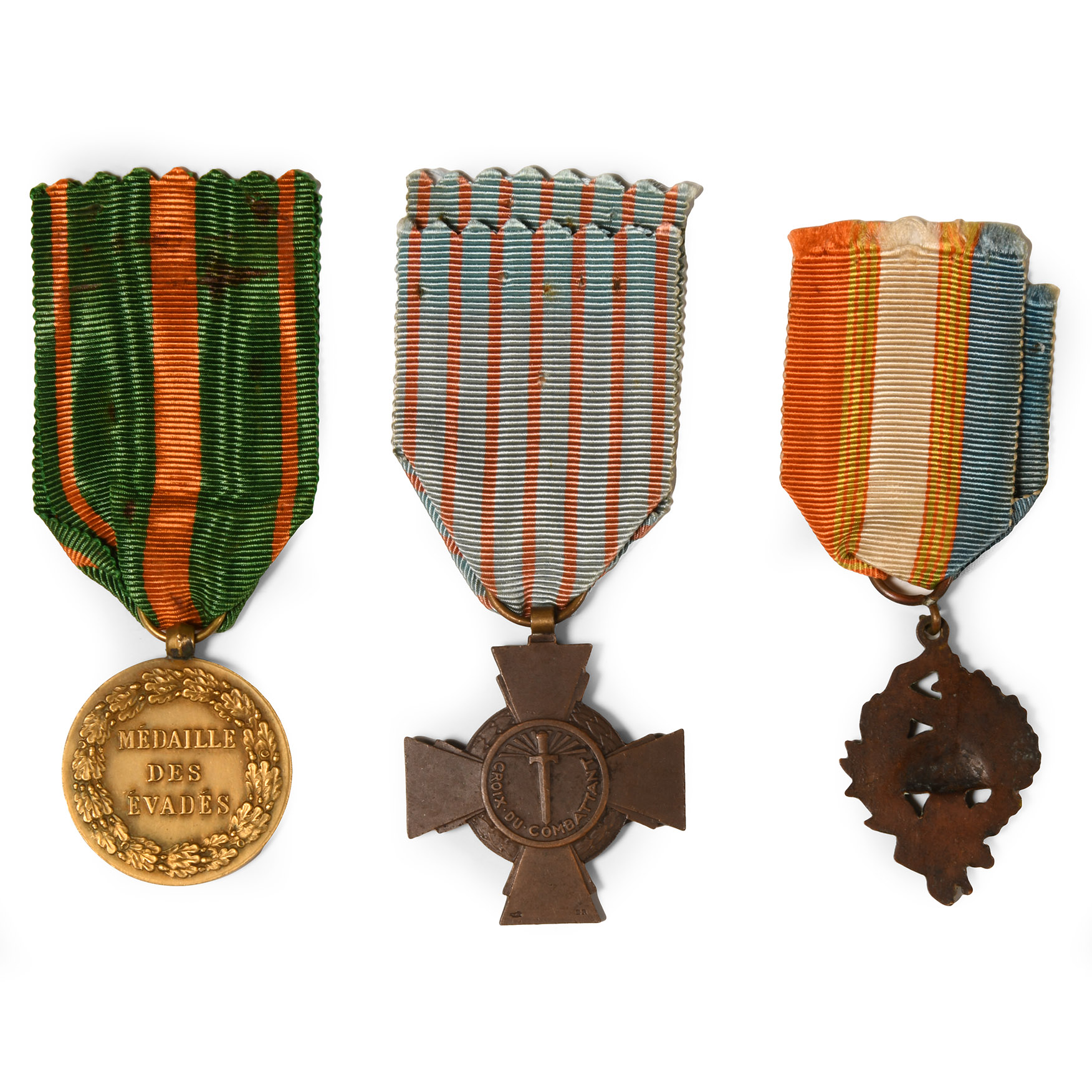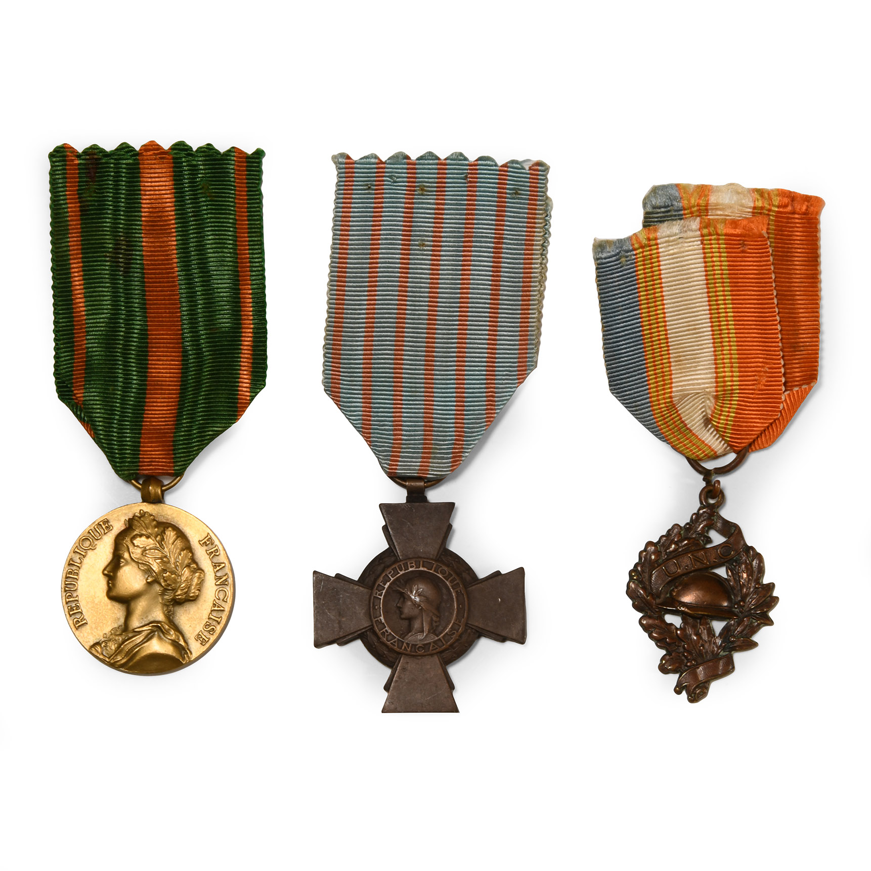Comprising: mixed group of French medals issued for service in WWI, including French Escaped Prisoner Medal, Medal of the National Union of Combattants, and U.N.C. Combat Veteran Medal. 41.58gr, 51-43mm excluding ribbon