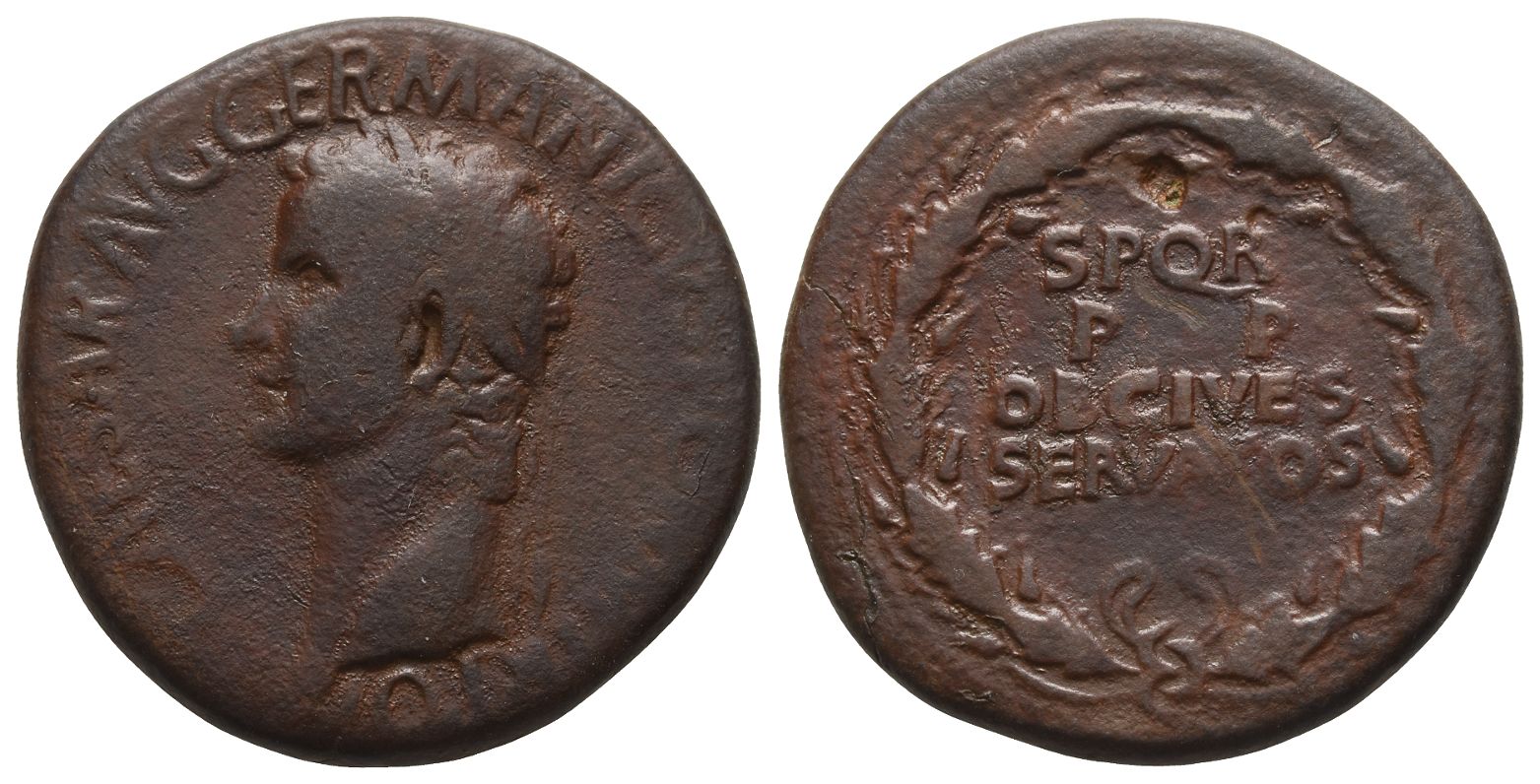 Rome mint; struck AD 37-41. C CAESAR AVG GERMANICVS PON M TR POT, laureate head to left / S P Q R P P OB CIVES SERVATOS in four lines within oak wreath. RIC I 37; Cohen 24; BMCRE 38; BN 50. 24.28gr, 34mm, 6h.