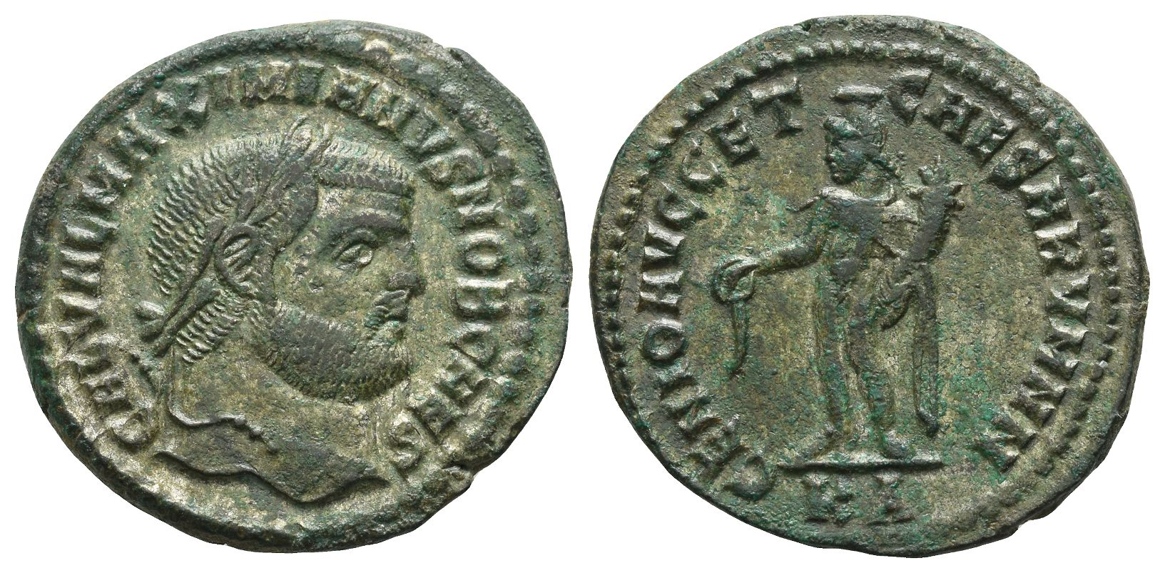 GAL VAL MAXIMIANVS NOB CAES, laureate head to right / GENIO AVGG ET CAESARVM NN, Genius, wearing modius on head, standing to left, holding patera and cornucopia, from which liquor flows; KA in exergue. RIC VI 9b. 10.43gr, 28mm, 6h.