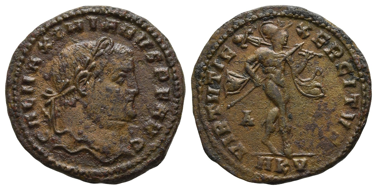 Cyzicus mint; struck AD 308-309. 1st officina. GAL MAXIMIANVS P F AVG, laureate head to right / VIRTVTI EXERCITVS, Virtus advancing to right, holding transverse spear and trophy over shoulder; A in left field, MKV in exergue. RIC VI 47. 7.06gr, 26mm, 12h.