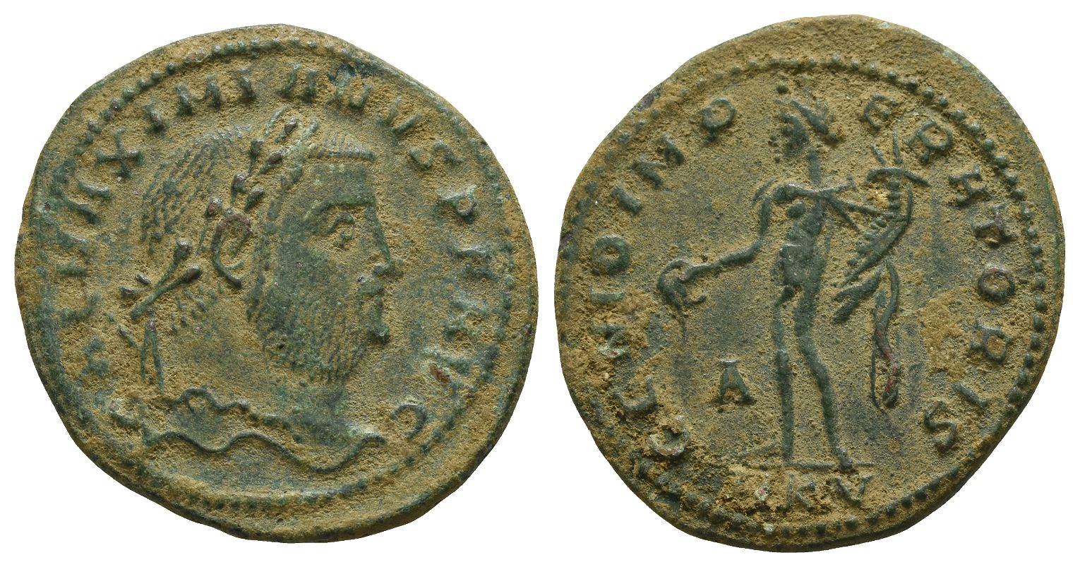 GAL MAXIMIANVS P F AVG, laureate head to right / GENIO IMPERATORIS, Genius standing to left, modius on head, naked except for chlamys over left shoulder, holding patera and cornucopia; A in left field, MKV in exergue. RIC VI 44. 6.74gr, 28mm, 7h.