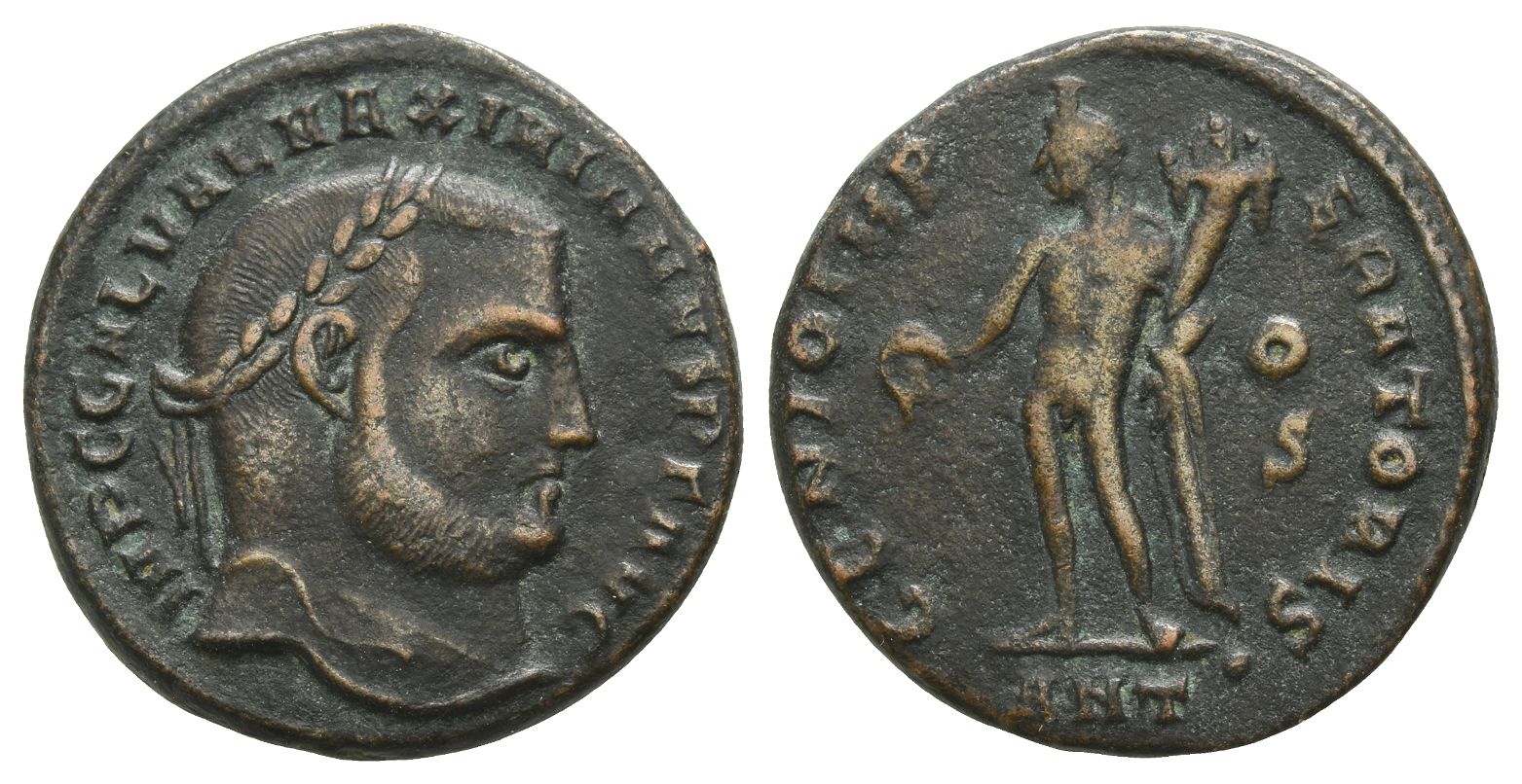 IMP C GAL VAL MAXIMIANVS P F AVG, laureate head to right / GENIO IMPERATORIS, Genius standing to left, holding patera, from which liquid pours, and cornucopia; O above S in right field, ANT• in exergue. RIC VI 112a. 6.60gr, 23mm, 11h.
