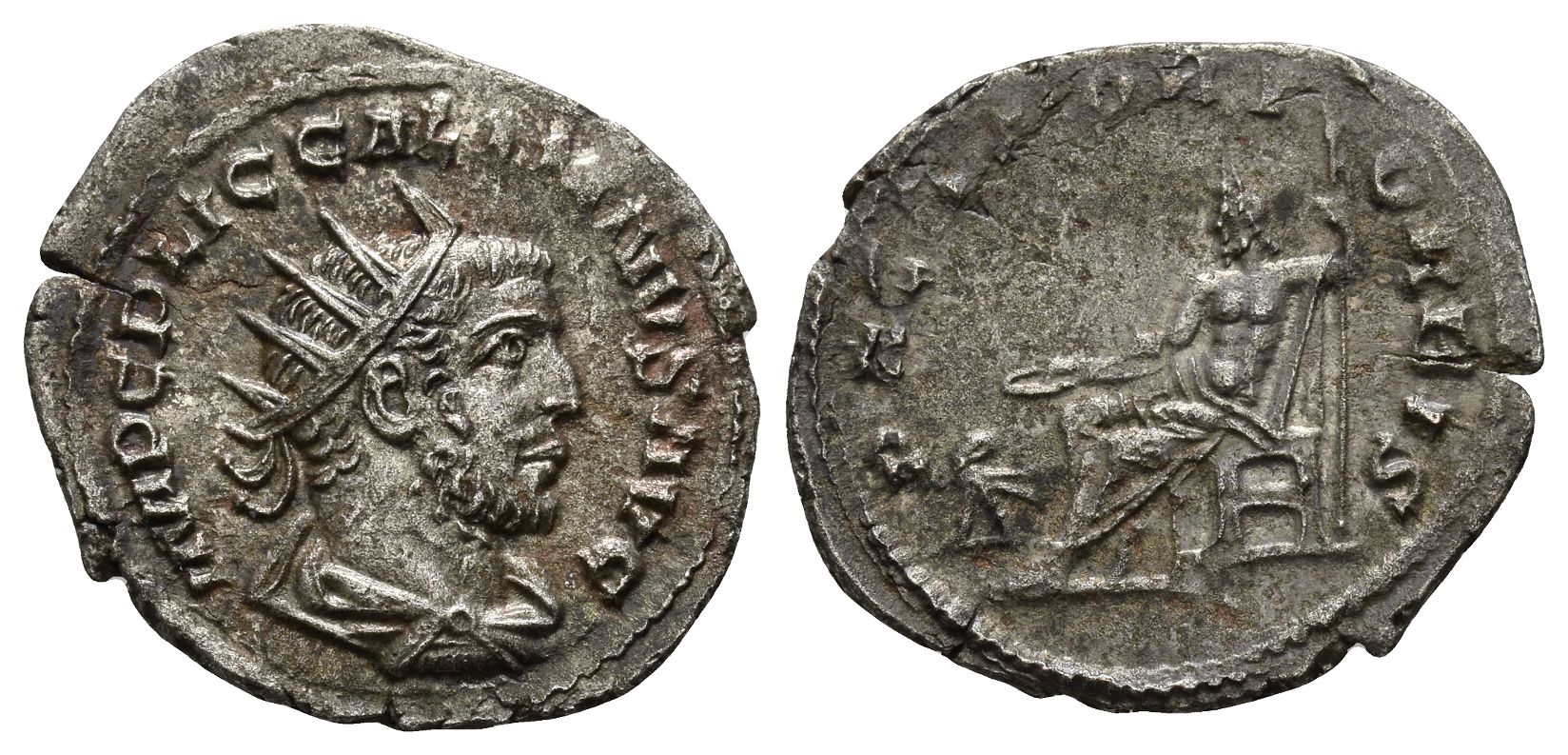 Antioch mint; struck AD 253-254. 1st emission. IMP C P LIC GALLIENVS AVG, radiate, draped, and cuirassed bust to right, seen from rear / PACATORI ORBIS, Jupiter seated to left, holding patera with right hand and sceptre with left; at his feet, eagle standing to left, head to right. RIC V.1 294 (Viminacium) var. (bust type); MIR 36, 1562d; RSC 714 (Viminacium) var. (same). 3.05gr, 24mm, 11h