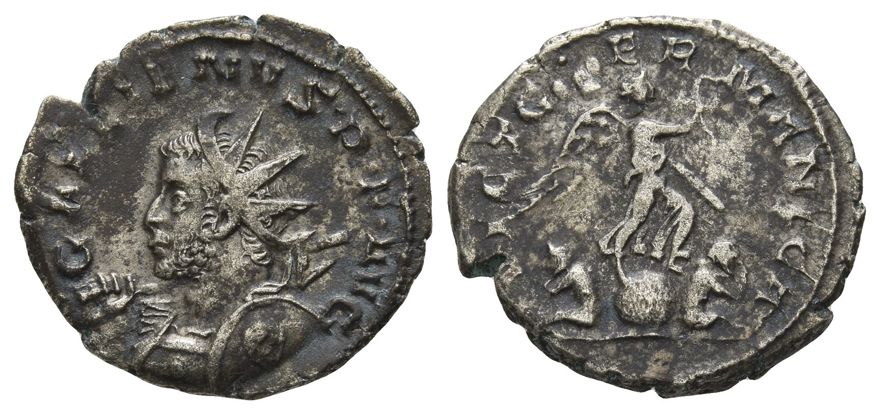 Colonia Agrippinensis mint; struck AD 258-259. GALLIENVS P F AVG, radiate and cuirassed bust to left, holding shield and spear / VICT GERMANICA, Victory standing to right on globe between two seated captives, holding wreath. RIC V.1 49 (Lugdunum, joint reign); MIR 874m; RSC 1065. 3.30gr, 22mm, 6h.