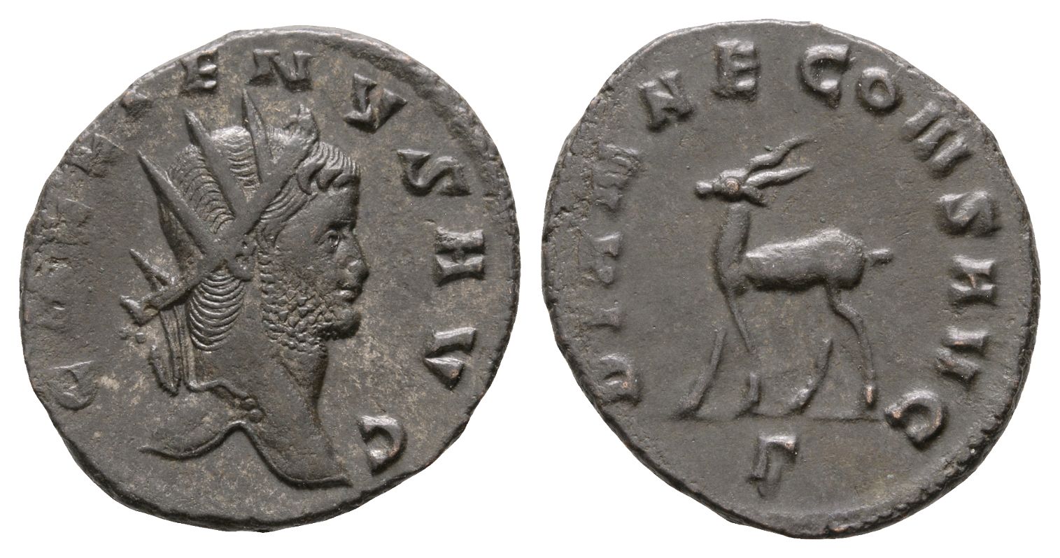 Rome mint; struck AD 267-268. 3rd officina. GALLIENVS AVG, radiate head to right / DIANAE CONS AVG, antelope advancing to left; Γ in exergue. RIC V.1, 181 (sole reign); MIR 716b1; RSC 165. 3.37gr, 21mm, 6h