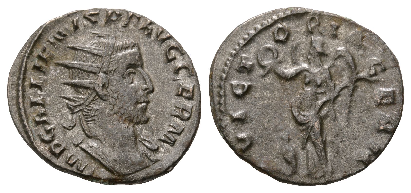 Rome mint; struck AD 257-258. IMP GALLIENVS P F AVG GERM, radiate and cuirassed bust to right / VICTORIA GERM, Victory standing facing, head to left, holding wreath with right hand and palm with left; at feet, captive. RIC V.1 175 (joint reign); MIR 117k; RSC 1162. 2.69gr, 21mm, 5h