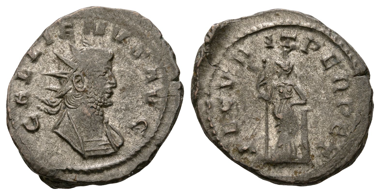 Rome mint; struck AD 265-267. GALLIENVS AVG, radiate and cuirassed bust to right / SECVRIT PERPET, Securitas standing facing, head to left, legs crossed, leaning on column with left arm and holding sceptre with right hand. RIC V.1 516 (Mediolanum, sole reign); MIR 591w; RSC 962. 4.58gr, 23mm, 7h