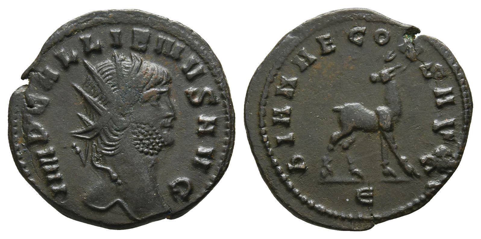 Rome mint; struck AD 267-268. 5th officina. IMP GALLIENVS AVG, radiate head to right / DIANAE CONS AVG, deer standing to right, head reverted; Є in exergue. RIC V.2 176 (sole reign); MIR 728z; RSC 153. 3.19gr, 21mm, 2h