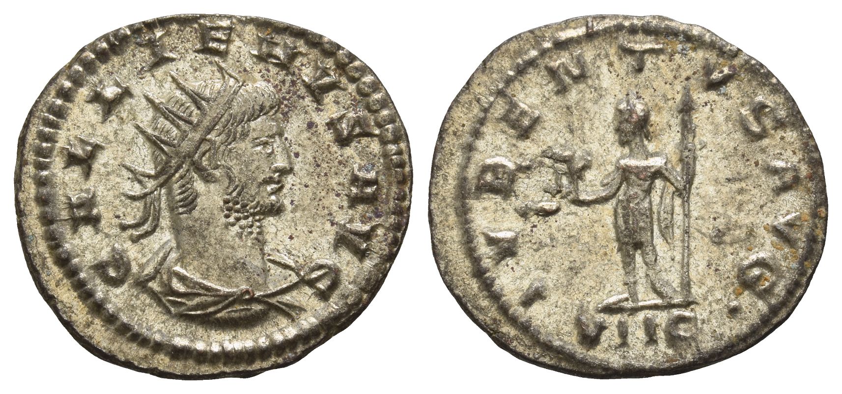 Antioch mint; struck AD 266. GALLIENVS AVG, radiate, draped and cuirassed bust to right / IVBENTVS AVG, emperor standing to left, holding Victory and spear; VIIC • in exergue. RIC V.1 615 (Asia, sole reign) var. (bust type; mintmark). 3.00gr, 22mm, 6h
