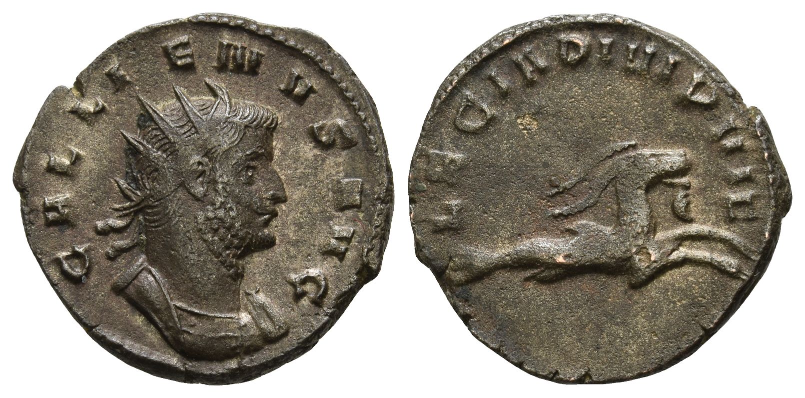 Mediolanum mint; struck AD 260-261. "Legionary series" issue. GALLIENVS AVG, radiate and cuirassed bust to right / LEG I ADI VI P VI F, capricorn to right. RIC V.1 315 (joint reign); MIR 982r; RSC 447. 4.27gr, 22mm, 12h