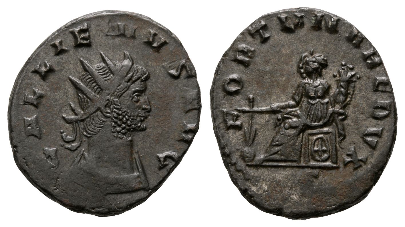 Rome mint; struck AD 263-265. 6th officina. GALLIENVS AVG, radiate and cuirassed bust to right / FORTVNA REDVX, Fortuna seated to left, holding rudder with right hand and cornucopia with left, wheel beneath seat; ς in exergue. RIC V.1, 194a (sole reign); MIR 546g; RSC 279a. 3.76 gr, 20 mm, 11h.