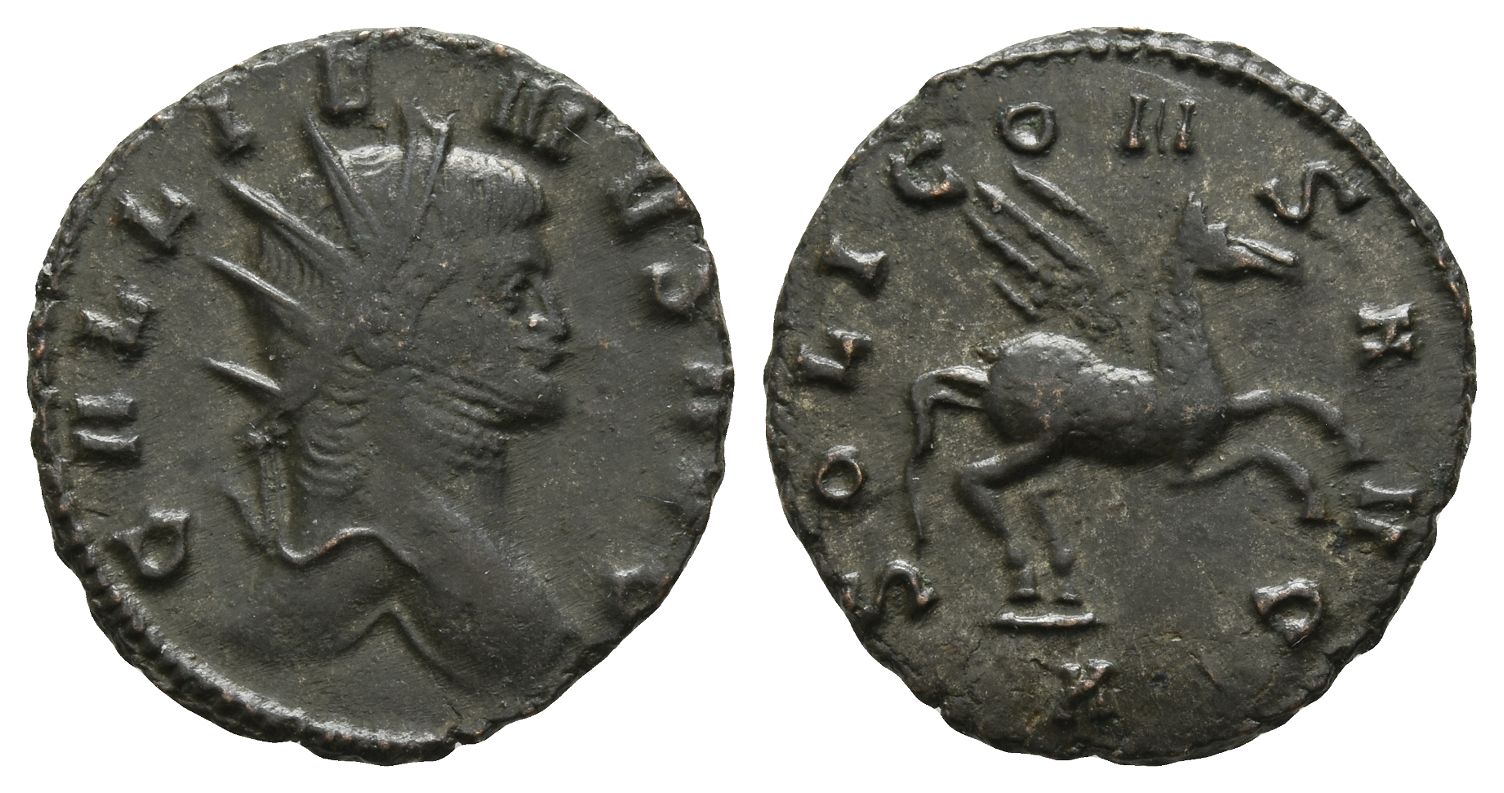 Rome mint; struck AD 267-268. 1st officina. GALLIENVS AVG, radiate head to right / SOLI CONS AVG, Pegasus springing to right; A below. RIC V.1 283 (sole reign); MIR 712b; RSC 979. 3.19gr, 20mm, 11h.