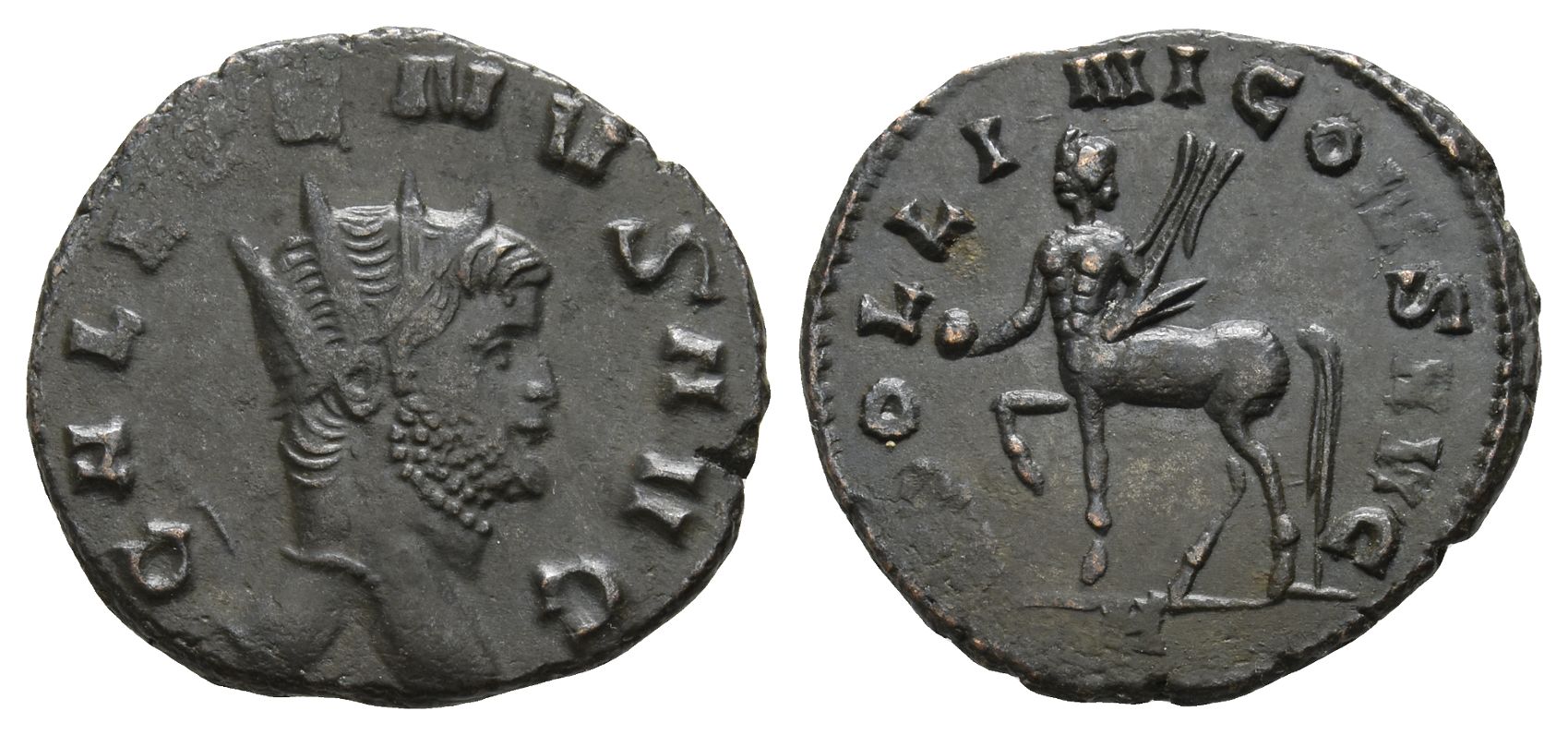 Rome mint; struck AD 267-268. 8th officina. GALLIENVS AVG, radiate head to right / APOLLINI CONS AVG, centaur walking to left, holding globe with right hand and rudder with left; H in exergue. RIC V.1 164 (sole reign); MIR 738b; RSC 73. 3.42gr, 20mm, 6h.