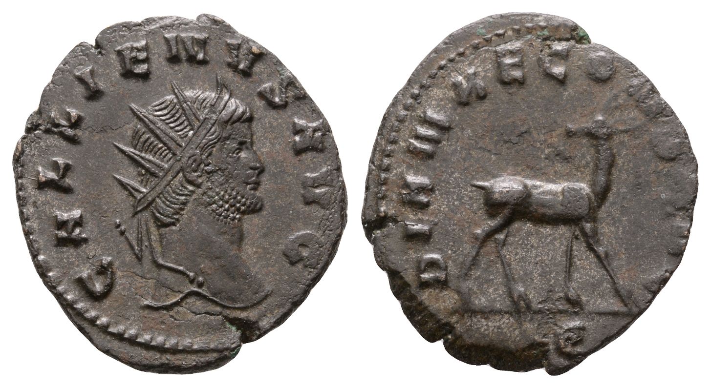 Rome mint; struck AD 267-268. 5th officina. GALLIENVS AVG, radiate head to right / DIANAE CONS AVG, doe walking to right, head reverted; Є in exergue. RIC V.1, 177 (sole reign); MIR 728b; RSC 154. 3.00gr, 21mm, 6h.