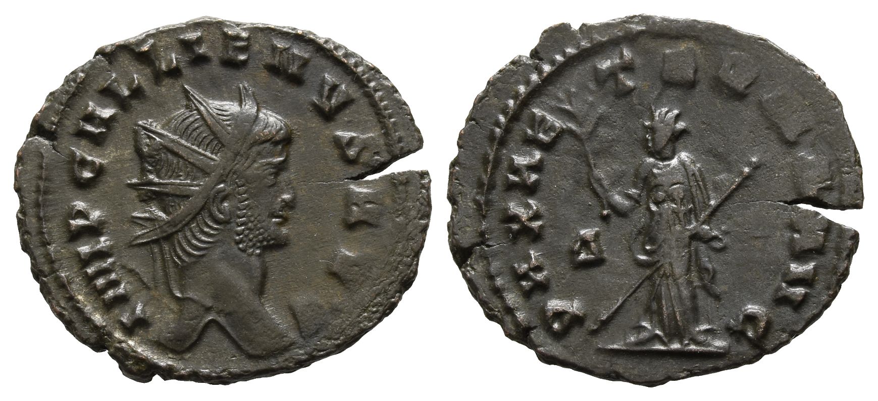 Rome mint; struck AD 265-267. 4th officina. IMP GALLIENVS AVG, radiate head to right / PAX AETERNA AVG, Pax standing to left, holding olive branch and sceptre; Δ in left field. RIC V.1 -, cf. 408 (sole reign); MIR 678q(1). 3.14gr, 23mm, 6h.