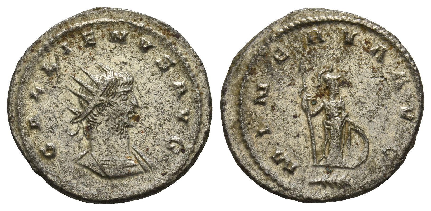 Antioch mint; struck AD 264-265. GALLIENVS AVG, radiate and cuirassed bust to right / MINERVA AVG, Minerva standing to right, holding shield and spear; palm in exergue. RIC V 651; MIR 36, 1634d; RSC 632. 3.41gr, 21mm, 12h.