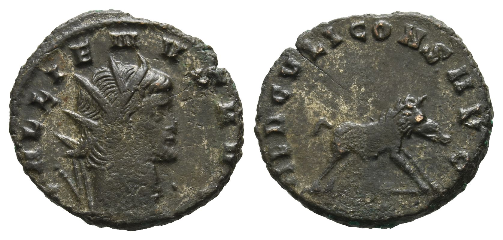 Rome mint. 10th emission, AD 267-268. 5th officina. "Animal/ Mythical" series. GALLIENVS AVG, radiate bust to right / HERCVLI CONS AVG, boar running to right; [Є in exergue]. RIC V.1 202 (sole reign); MIR 729b; RSC 317. 3.48gr, 20mm, 12h.