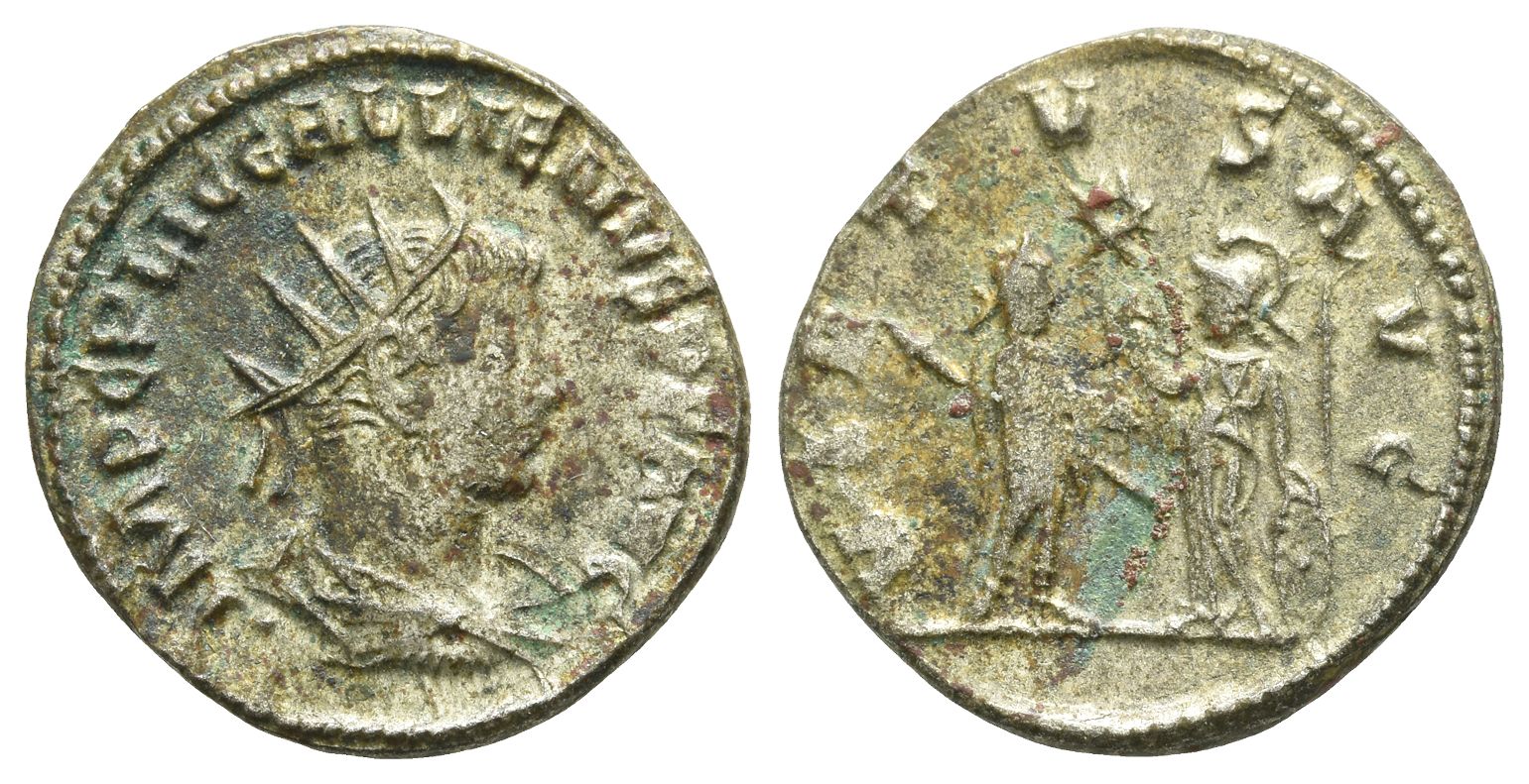 IMP C P LIC GALLIENVS P F AVG, radiate, draped and cuirassed bust to right / VIRTVS AVG, emperor standing to right, holding spear, receiving wreath from Roma standing to left, holding spear and shield, wreath in field above. RIC V.1 (joint reign) 457 var. (emperor receiving Victory); MIR 1704b; RSC 1266. 3.59gr, 22mm, 12h.
