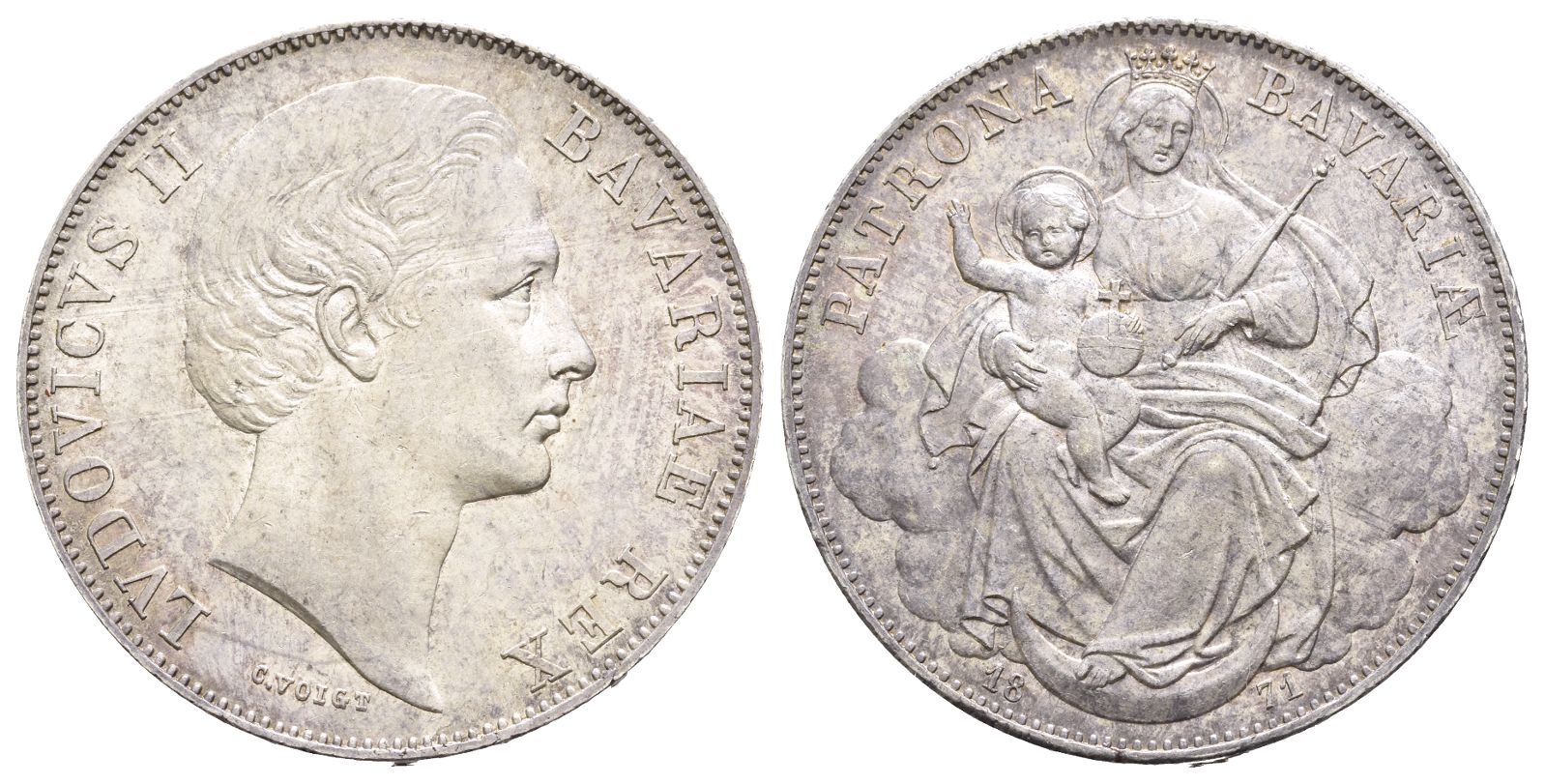 Designs by Carl Friedrich Voigt. LVDOVICVS II BAVARIAE REX, head to right, C.VOIGT in small lettering below / PATRONA BAVARIÆ, nimbate seated figures of Saint Mary with Child, seated over crescent moon on clouds; date below. Edge inscription: XXX EIN PFUND FEIN. AKS 176; Jaeger 5 Bay 107; KM 877. 18.49gr, 33mm, 12h.