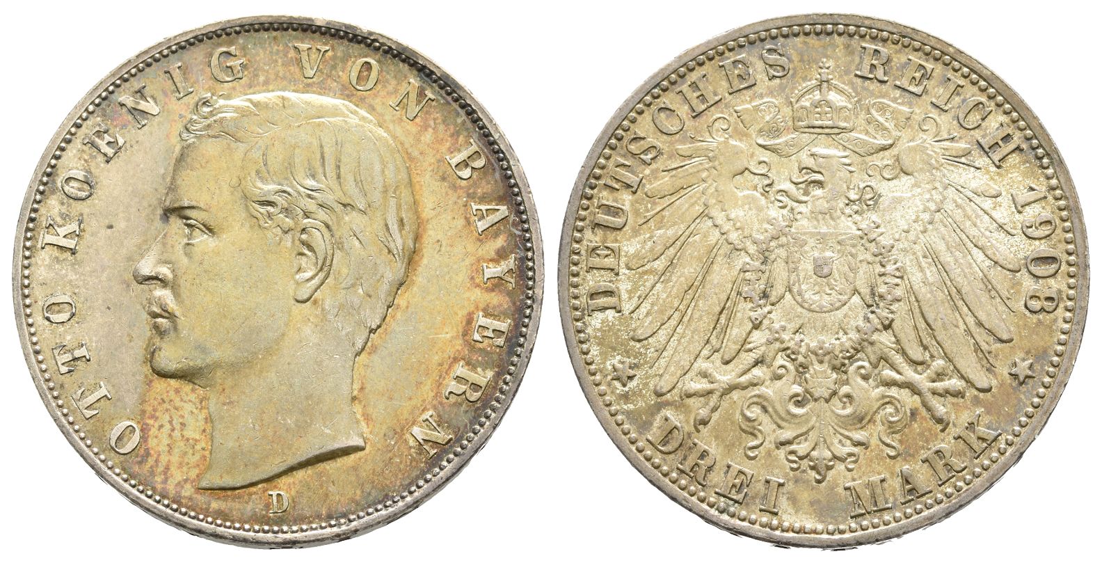 OTTO KOENIG VON BAYERN, head to left, D below / DEUTSCHES REICH 1908, crowned imperial eagle, shield on breast; denomination below. Edge inscription: GOTT MIT UNS. KM 996; Jaeger 47; AKS 202. 16.67gr, 33mm, 12h.