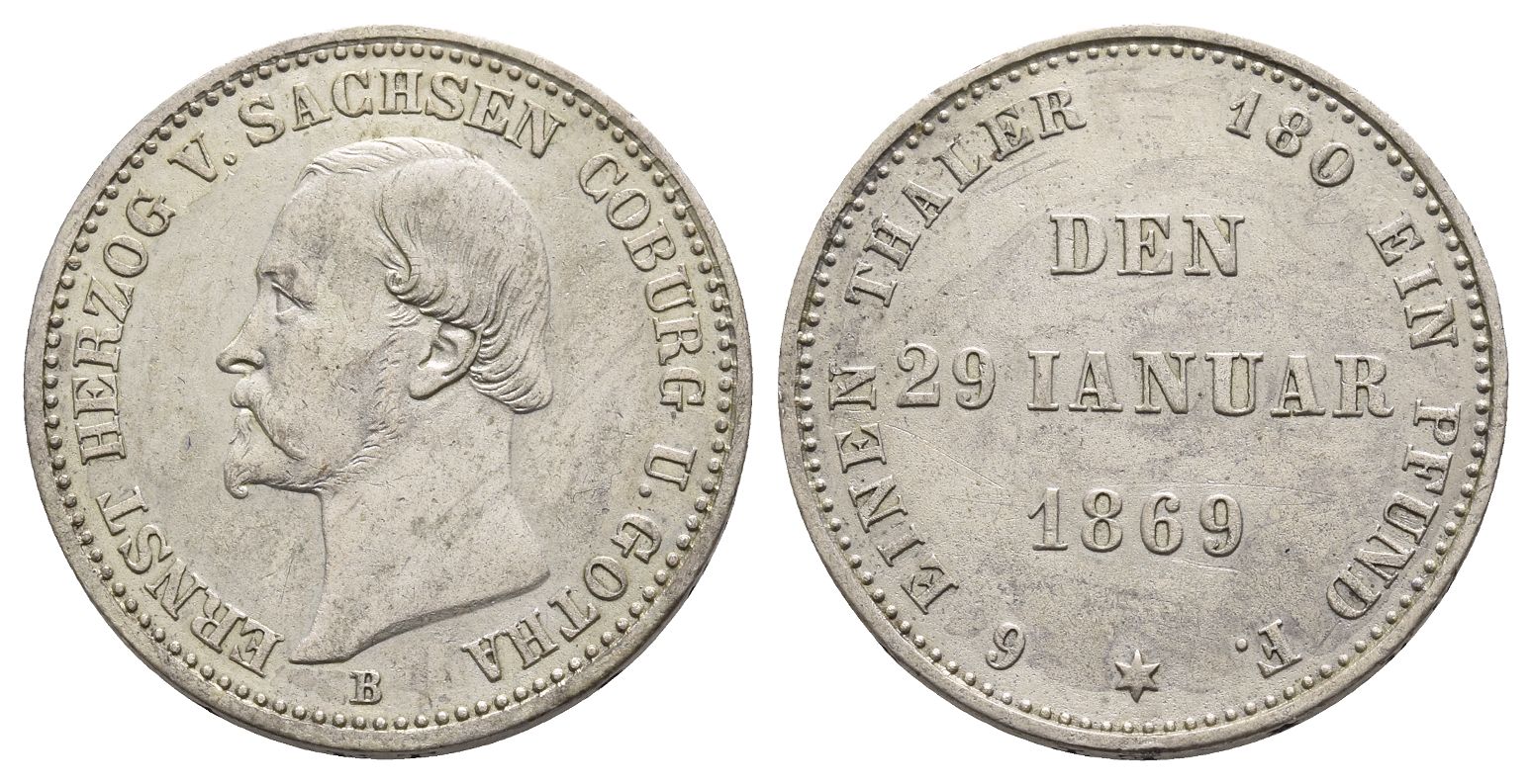Gustav Julius Buschick, Mint Master. ERNST HERZOG V. SACHSEN COBURG U. GOTHA, head to left, B below / ✶ 6 EINEN THALER 180 EIN PFUND F. around DEN 29 IANUAR 1869 in three lines. Edge inscription: ✶ FIDELITER ✶ ET ✶ CONSTANTER. AKS 118; Jaeg 11 Sac 297; KM 150. 5.26gr, 23mm, 12h.