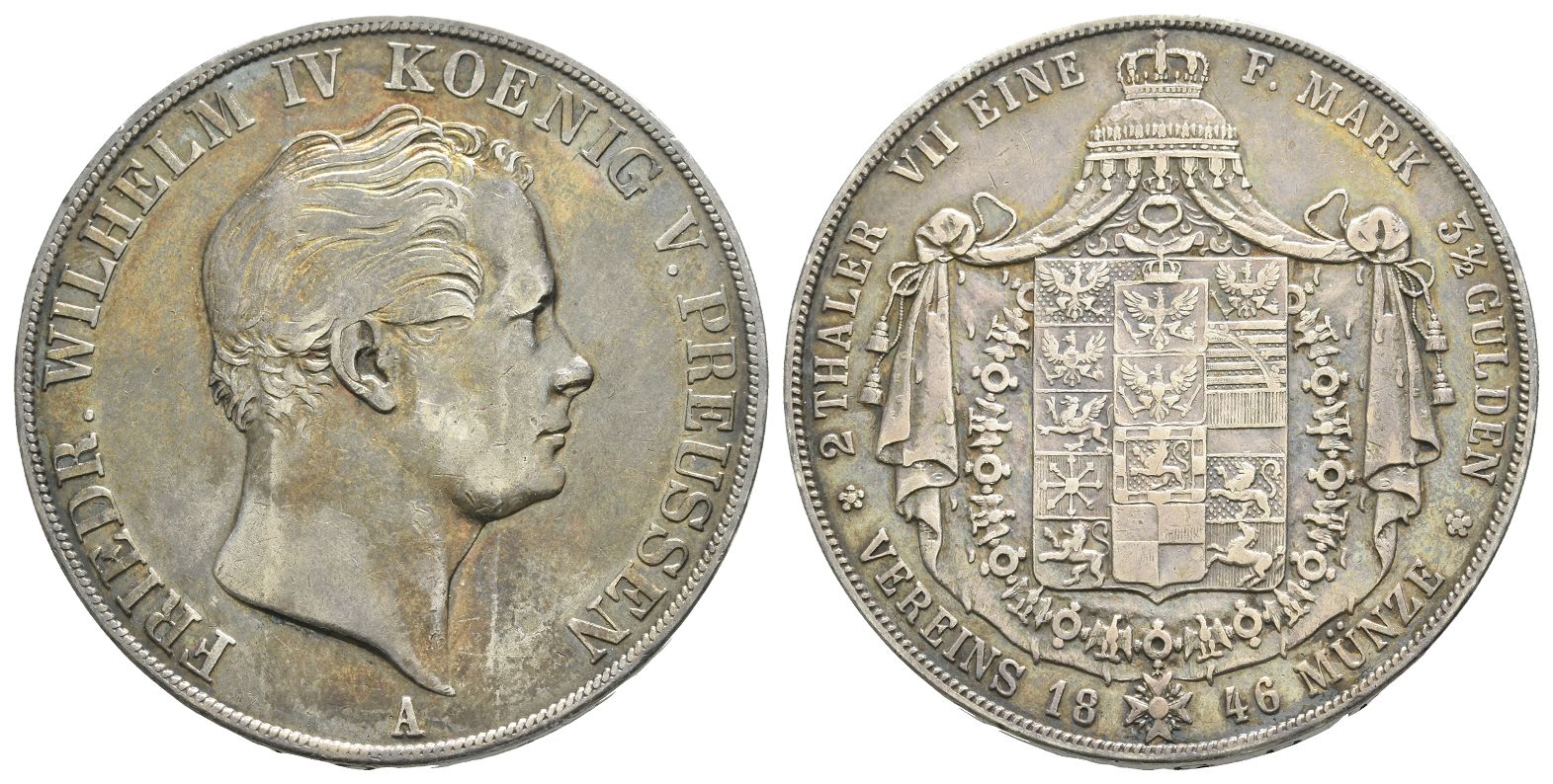 FRIEDR. WILHELM IV KOENIG V. PREUSSEN, bare head to right; mintmark below / 2 THALER VII EINE F. MARK 3 1/2 GULDEN and VEREINS 18-46 MÜNZE, draped and crowned coat of arms. KM 440; AKS 69; Thun 253. 36.97gr, 41mm, 12h.