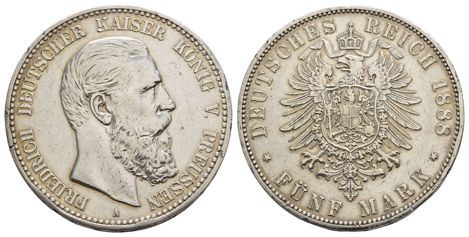 FRIEDRICH DEUTSCHER KAISER KÖNIG V. PREUSSEN, head to right, A (mintmark) below. DEUTSCHES REICH 1888 ★ FÜNF MARK ★, crowned eagle facing with wings spread, head to left; collared coat-of-arms on breast. Edge inscription: GOTT MIT UNS. KM 512; Jaeger 99; Davenport 787. 27.59gr, 38mm, 12h.