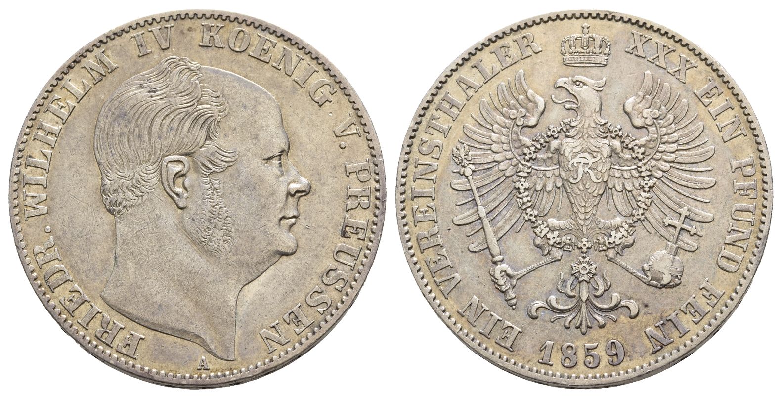 FRIEDR. WILHELM IV KOENIG V. PREUSSEN, head to right, A (mintmark) below / EIN VEREINSTHALER XXX EIN PFUND FEIN, crowned Imperial Eagle; date below. Edge inscription: GOTT MIT UNS. AKS 78; Jaeger 9 Pr 84; KM 471; Davenport GT III 775. 18.44gr, 33mm, 12h.