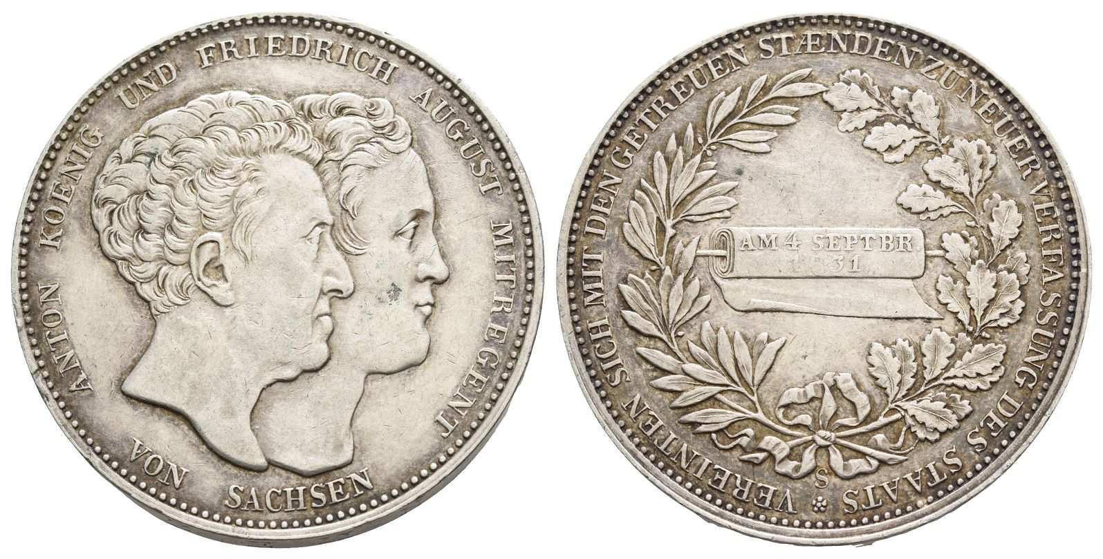 Johann Georg Studer, Mint Master. ANTON KOENIG UND FRIEDRICH AUGUST MITREGENT VON SACHSEN, jugate head to right / VEREINTEN SICH MIT DEN GETREUEN STAENDEN ZU NEUER VERFASSUNG DES STAATS, scroll of the Constitution inscribed AM 4. SEPTBR. 1831; all within crown of olive and oak branches; S below. Edge inscription: ZEHN EINE FEINE MARK. KM 1133; AKS 84. 27.81gr, 37mm, 12h.