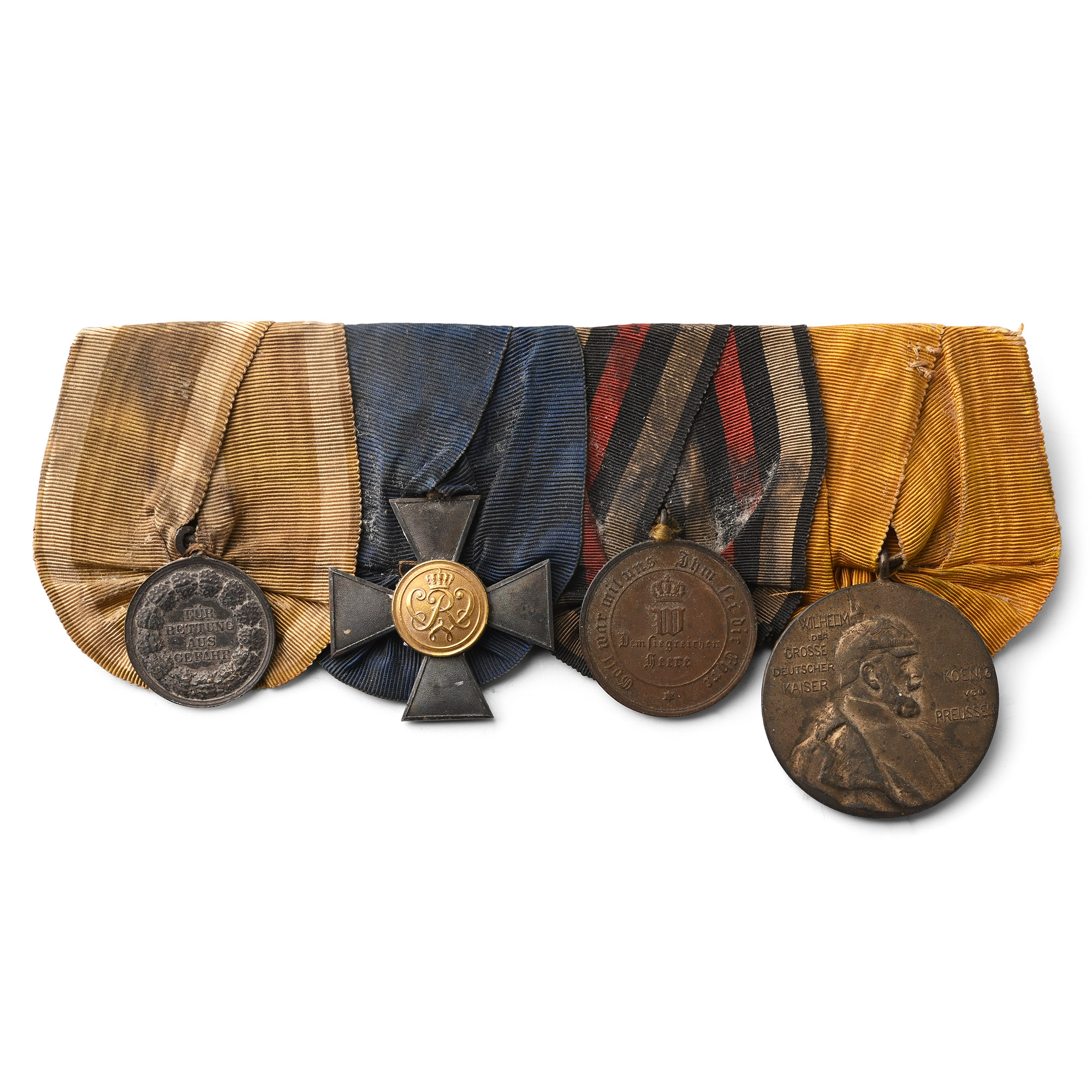 Group of four medals and ribbons on a carrier: Wilhelm 1 100th anniversary medal; 1870-1871 campaign medal; bravery under fire medal; twenty years' service medal. 108gr, 17.5cm.