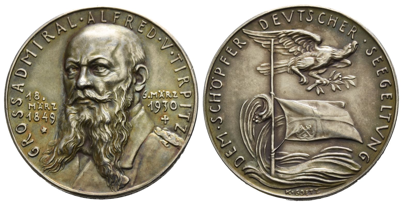 Munich mint. Design by Karl Goetz GROSSADMIRAL • ALFRED • V • TIRPITZ, uniformed bust of Grossadmiral von Tirpitz facing slightly to left; 18. MÄRZ 1849 ⋆ in four lines to left; 6. MÄRZ 1930 + in three lines to right / DEM • SCHÖPFER DEVTSCHER • SEEGELTVNG, eagle flying to right above flag in the sea and holding laurel branch; K • GOETZ below. Edge inscription: BAYER. HAUPTMÜNZAMT • FEINSILBER. Kienast 444. 19.71gr, 36mm, 12h.