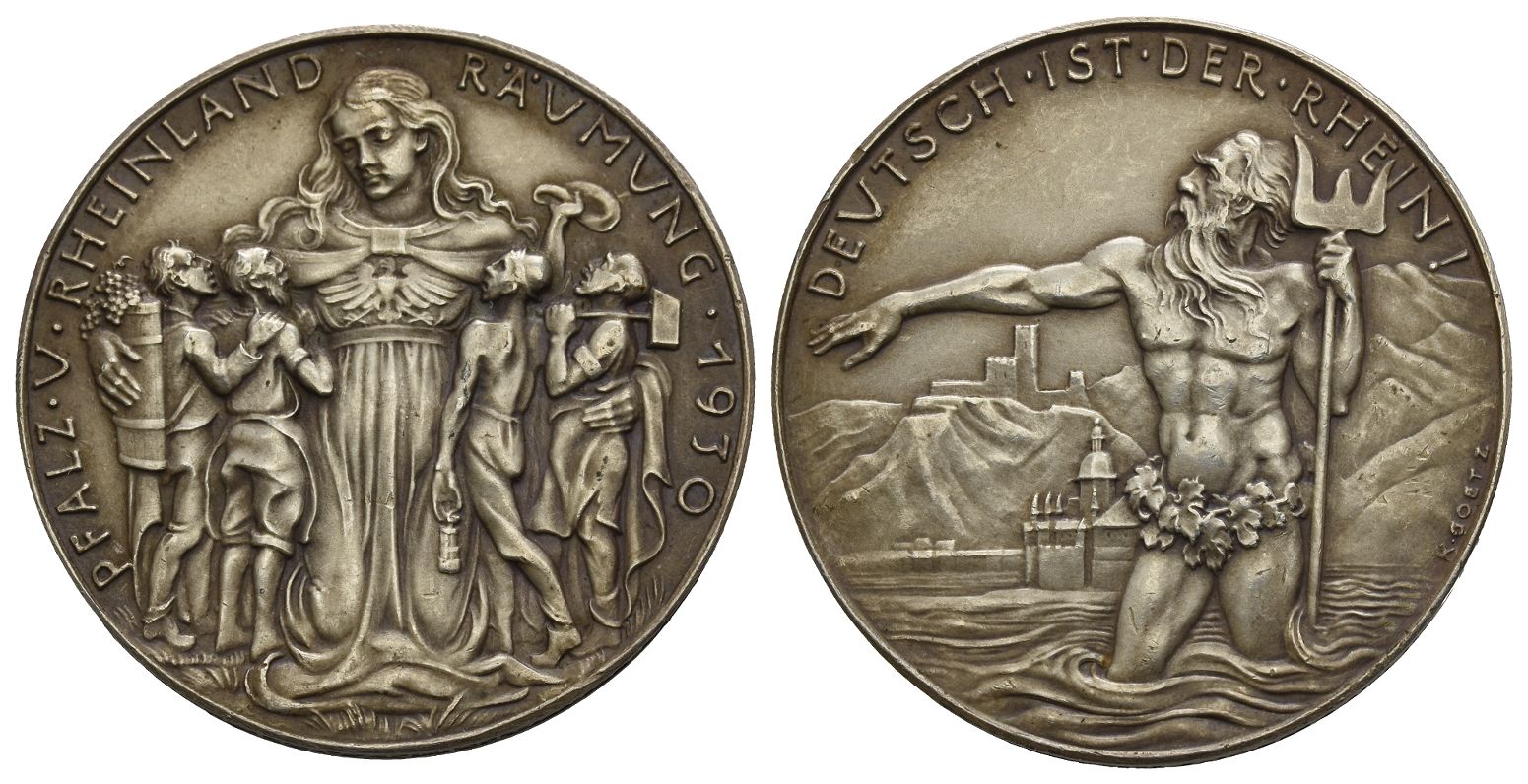 Design by Karl Goetz. PFALZ • U • RHEINLAND RÄUMUNG • 1930, Germania between winegrowers and miners / DEUTSCH • IST • DER • RHEIN !, Neptune standing facing, head to left, raising right hand and holding trident with left; K•GOETZ before. Edge inscription: • BAYER. HAUPTMÜNZAMT • FEINSILBER •. Kienast 450. 19.85gr, 36mm, 12h.
