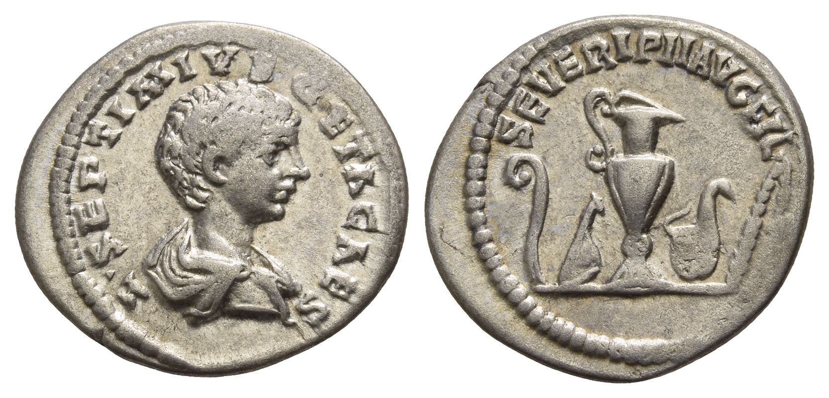 L • SEPTIMIVS GETA CAES, bare-headed and draped bust to right / SEVERI PII AVG FIL, priestly implements: lituus, knife, jug, simpulum, aspergillum. RIC IV 3; BMCRE 147 (Septimius and Caracalla); RSC 188. 3.13gr, 20mm, 7h.