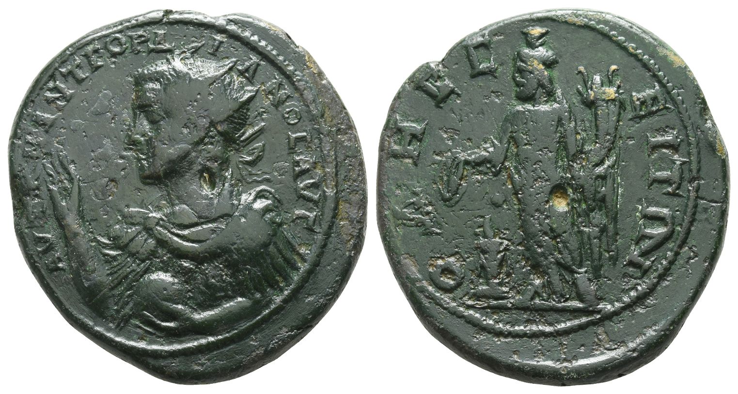 AYT K M ANT ΓOPΔIANOC AYΓ, radiate, draped and cuirassed bust to left, decorated with gorgoneion, raising right hand in salute and holding globe in left / OΔHCCEITΩN, The Great God standing facing, head to left, sacrificing from patera over lighted altar with his right hand and holding cornucopia in his left. RPC VII.2 1497; AMNG I 2314; Varbanov 4444. 30.48gr, 37mm, 12h.