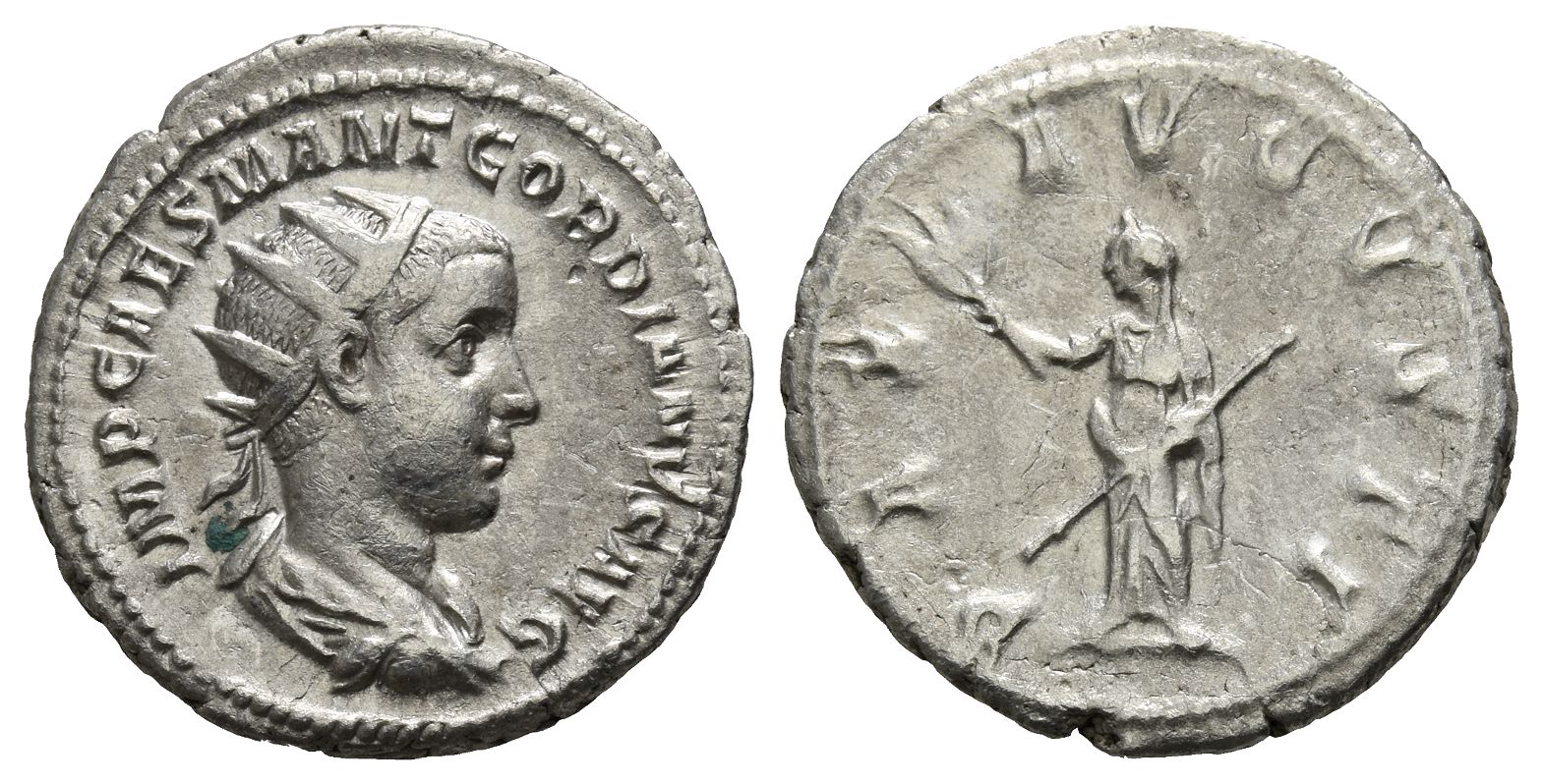 Rome mint; struck AD 238-239. IMP CAES M ANT GORDIANVS AVG, radiate, draped and cuirassed bust to right / PAX AVGVSTI, Pax standing facing, head to left, holding branch and sceptre. RIC IV 3; RSC 173. 4.39gr, 23mm, 7h.