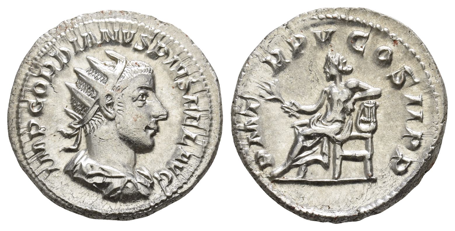 IMP GORDIANVS PIVS FEL AVG, radiate, draped and cuirassed bust to right / P M TR P V COS II P P, Apollo seated to left, holding branch and resting elbow on lyre. RIC IV 89; RSC 261. 4.63gr, 22mm, 8h.