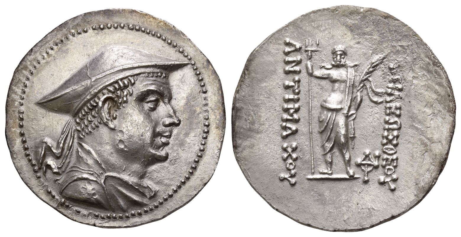 Diademed and draped bust to right, wearing kausia / BAΣIΛEΩΣ ΘΕΟΥ ANTIMAXOY, Poseidon, laureate, standing facing, holding trident with right hand and filleted palm with left; monogram of ΔΙΦ to inner right. Bopearachchi 1A; SNG ANS 274-5; HGC 12, 106. 17.30gr, 34mm, 12h