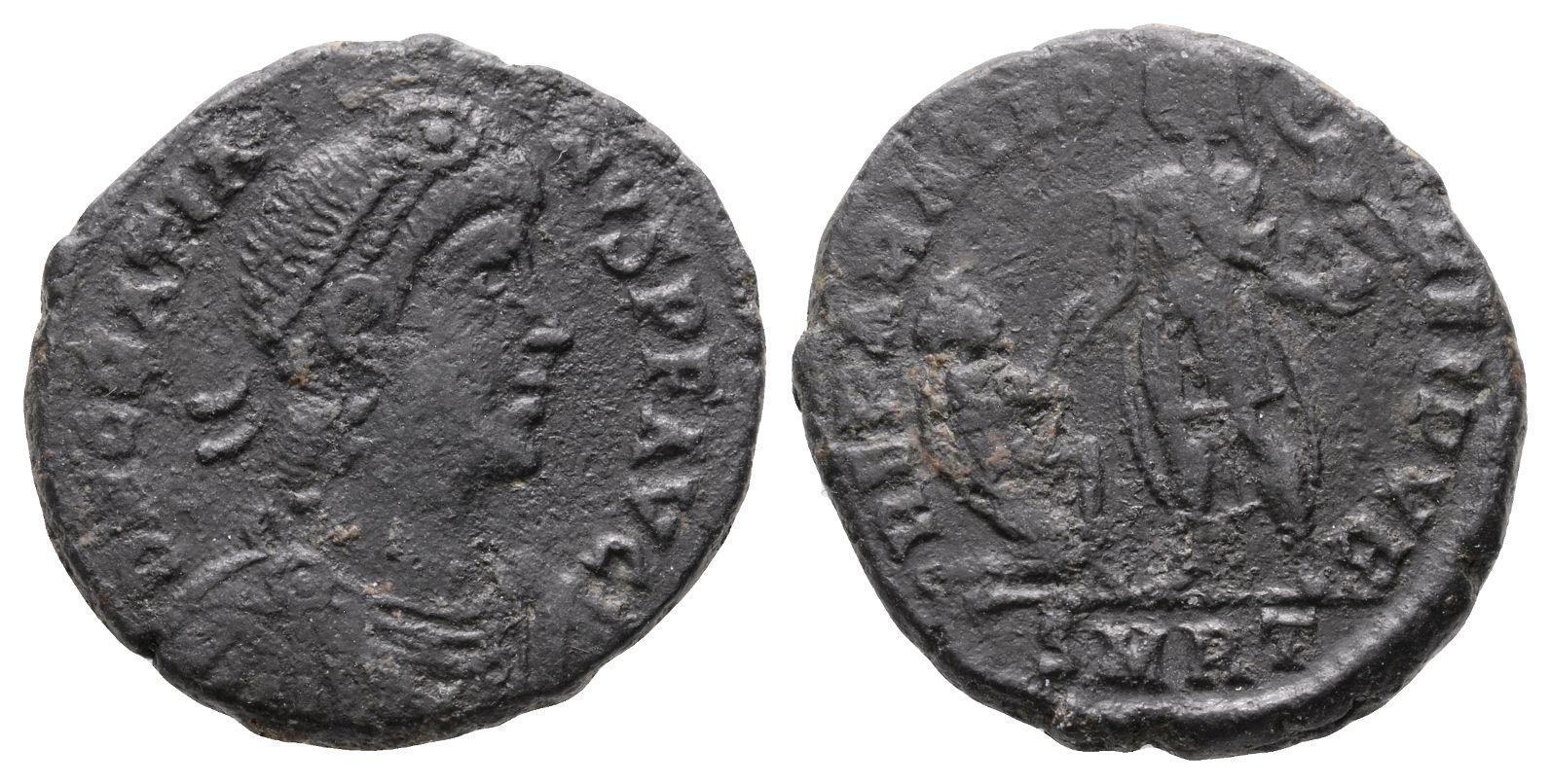 Rome mint; struck AD 378-383. 3rd officina. D N GRATIA-NVS P F AVG, pearl-diademed, draped and cuirassed bust to right / REPARATIO REIPVB, emperor standing facing, head to left, right hand raised, holding Victory on globe with left; kneeling woman to right on left, SMRT in exergue. RIC IX 43a. 7.54gr, 23mm, 5h