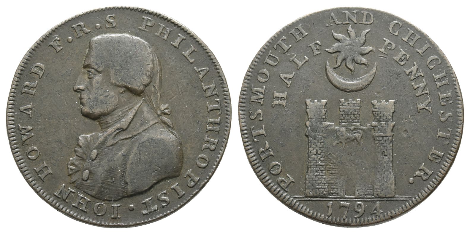 IOHN HOWARD F.R.S.PHILANTHROPIST, bust to left / PORTSMOUTH AND CHICHESTER HALFPENNY, the sun and moon over castle; date below. Edge inscription: PAYABLE AT SHARPS PORTSMOUTH AND CHALDECOTTS CHICHESTER. D&H Sussex.19; A.18. 9.69gr, 29mm, 6h