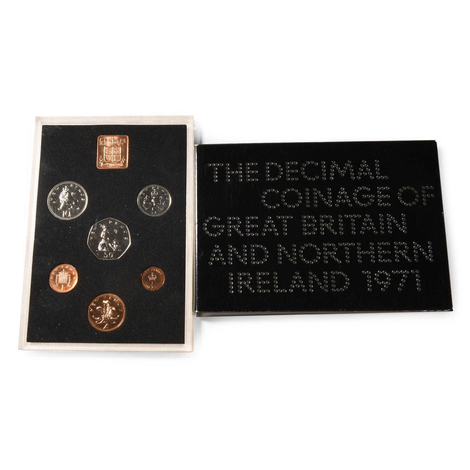 The Decimal Coinage of Great Britain And Norther Ireland 1971: this proof set contains some of the first examples of these coins, in clear sealed perspex container, the coins mounted in black, held with their original outer cardboard box envelope. 205gr total, 17 x 12 cm including box