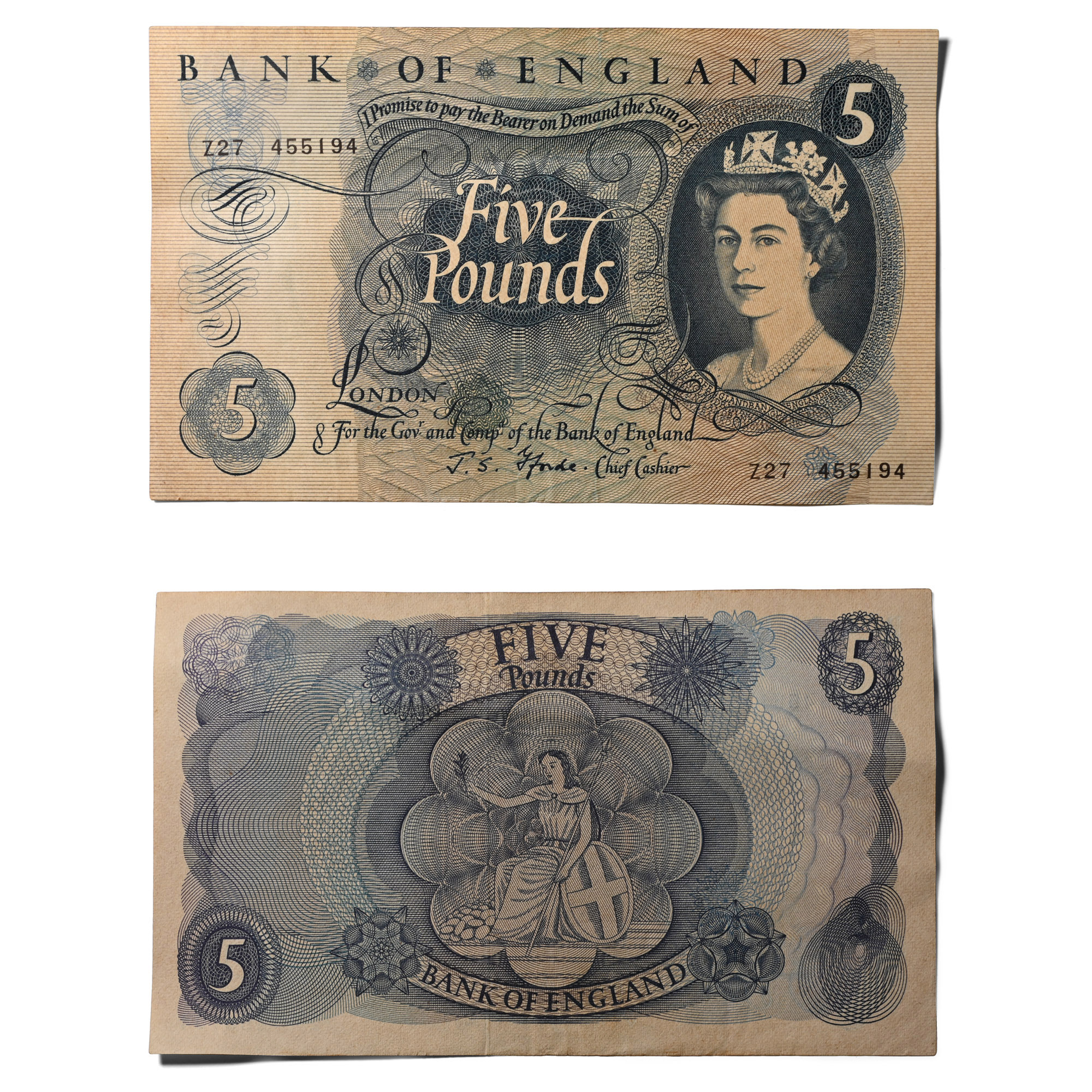 1966-1970. John Standish Fforde, Chief Cashier. Series C. Designs by Reynolds Stone. BANK OF ENGLAND; I Promise to pay the Bearer on Demand the Sum of; Five Pounds; LONDON; For the Govr. and Compa. of the Bank of England; Chief Cashier, portrait of Queen Elizabeth II to right / FIVE Pounds; BANK OF ENGLAND, seated figure of Britannia with shield, spear and olive branch, within 8-petalled pattern at centre. Watermark: Laureate heads in continuous vertical line. P 375b. 140mm x 85mm.