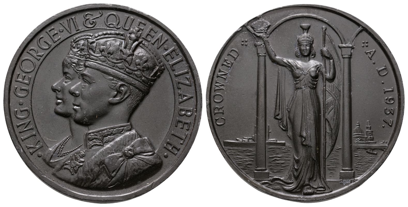 KING GEORGE VI & QUEEN ELIZABETH, crowned busts of King George and Elizabeth to left / CROWNED A.D.1937, Britannia standing facing, holding flag with left hand and crown with right, all between arched pillars; St. Paul's and ship across water behind. BHM 486. 47.88gr, 44mm, 12h
