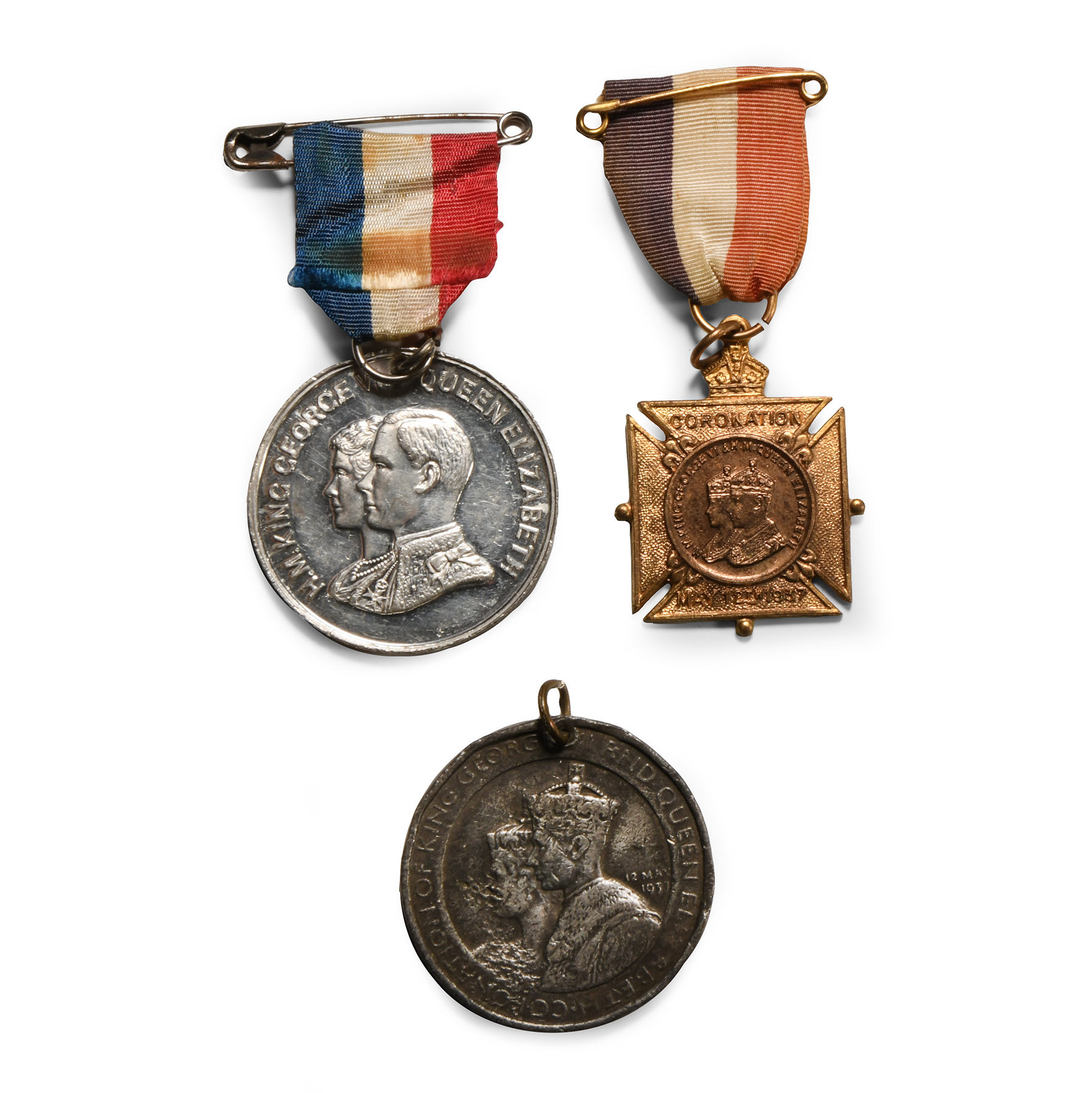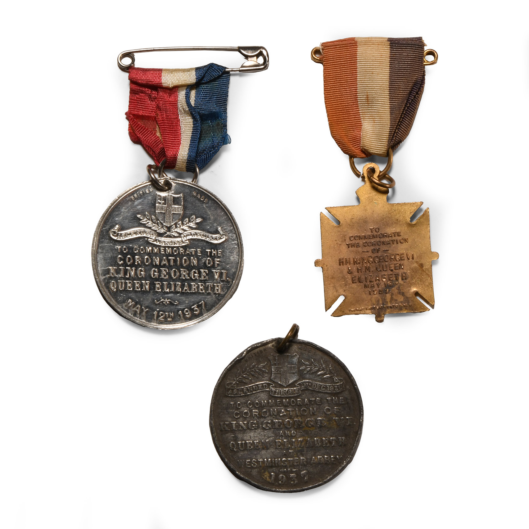 Comprising: three medals to commemorate George VI and Queen Elizabeth's coronation on 12th May 1937. 54.65gr total, 40-38mm excluding ribbon