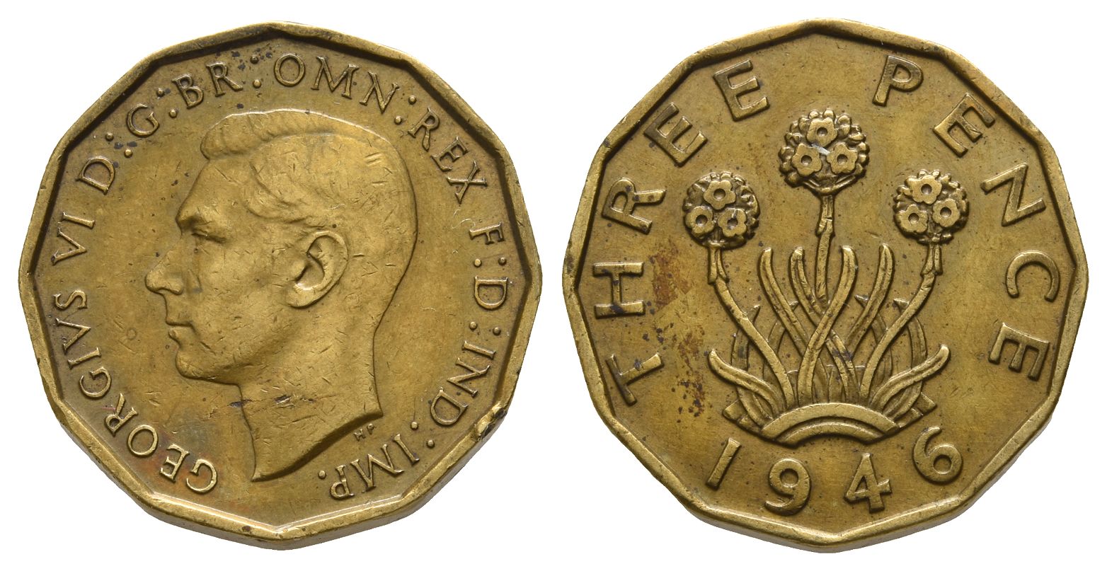 Design by Thomas Humphrey Paget and Madge Kitchener. GEORGIVS VI D:G:BR:OMN:REX F:D:IND:IMP., bare head to left; designer's initials below truncation / THREE PENCE, three-headed 'thrift' plant; date below. SCBC 4112; KM# 849. 6.77gr, 21mm, 12h