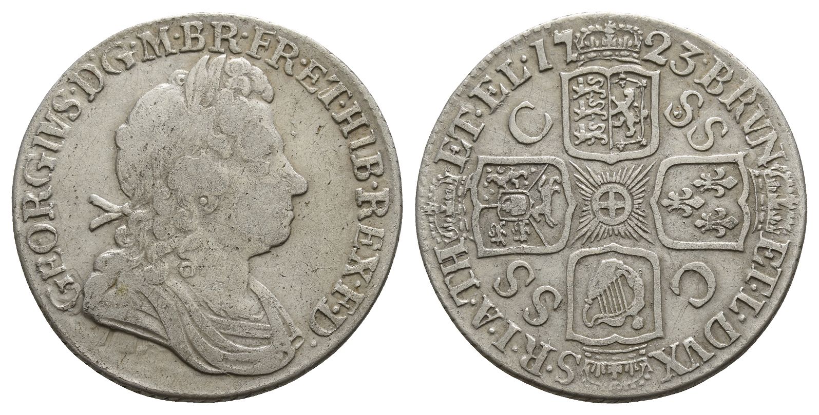 London mint. Dated 1723. South Sea Company issue. Designs by John Croker and Johann Ochs. GEORGIVS · D · G · M · BR · FR · ET · HIB · REX · F · D ·, first bust laureate, draped, and armored to right / · BRVN ET · L · DVX S · R · I · A · TH ET · EL · 17 23, crowned cruciform coats-of-arms around rayed Garter Star; SS and C alternating in angles. ESC 1176; SCBC 3647. 5.94gr, 25mm, 6h.