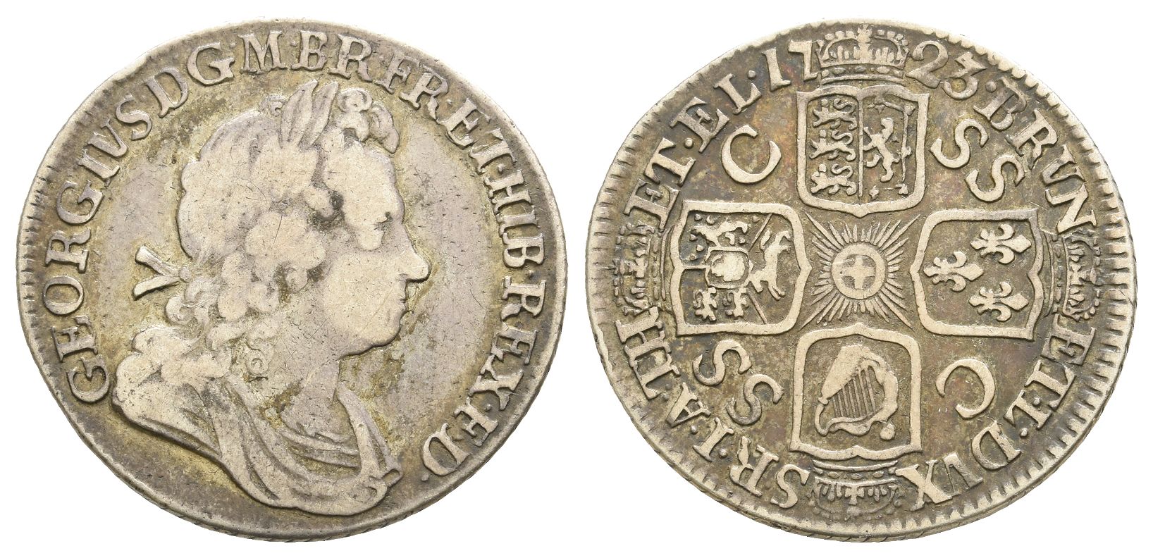 GEORGIVS · D · G · M · BR · FR · ET · HIB · REX · F · D ·, first bust laureate, draped, and armored to right / · BRVN ET · L · DVX S · R · I · A · TH ET · EL, crowned cruciform coats-of-arms around rayed Garter Star; SS and C alternating in angles. SCBC 3647. 5.86gr, 27mm, 6h.