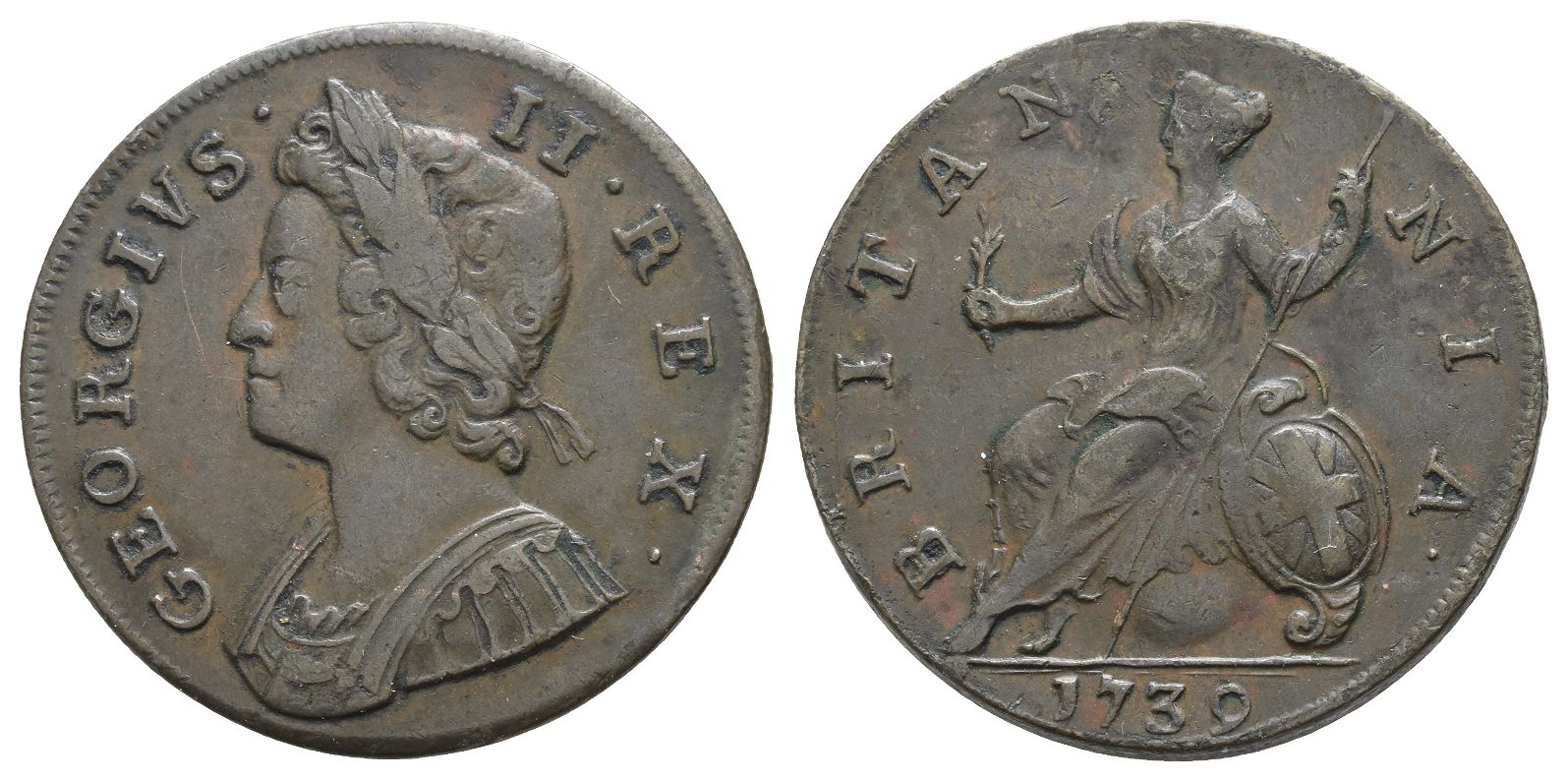 GEORGIVS • II • REX •, laureate and cuirassed bust to left / BRITAN-NIA •, Britannia seated to left on globe, holding olive branch and sceptre; Union shield to right, date below. SCBC 3717. 10.22gr, 28mm, 6h.