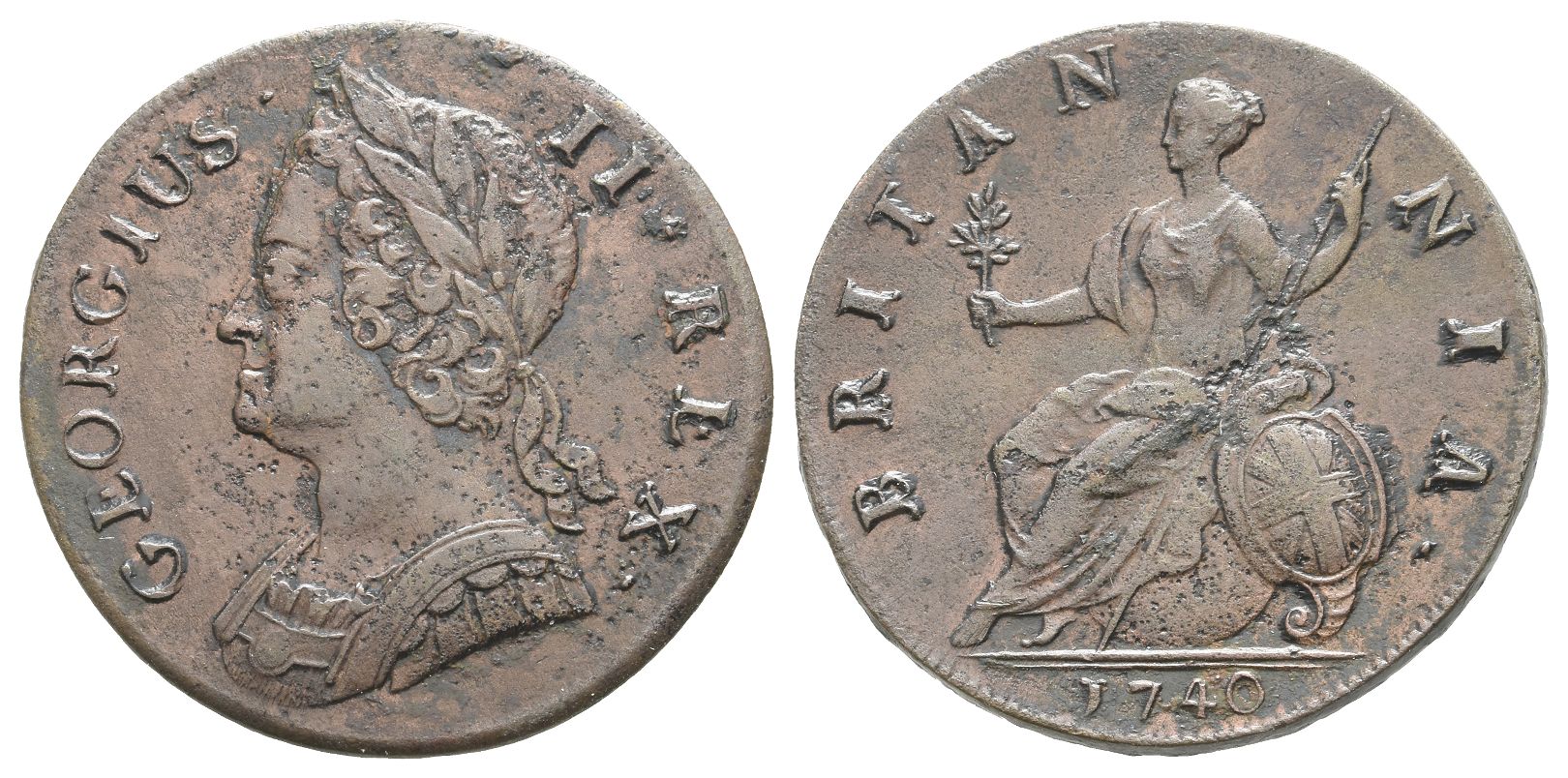 GEORGIUS • II • REX •, laureate and cuirassed bust to left / BRITAN-NIA •, Britannia seated to left on globe, holding olive branch and sceptre; Union shield to right, date below. SCBC 3718. 9.25gr, 29mm, 6h.